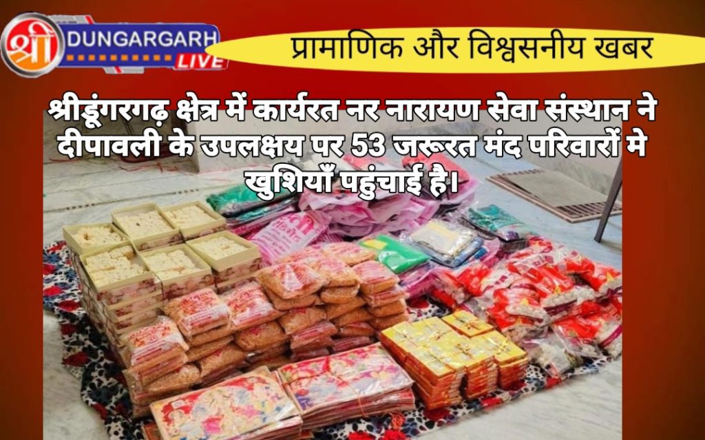 नर नारायण सेवा संस्थान के संस्थापक धनराज जस्सू रोड़ा वाले ने बताया है की प्रत्येक वर्ष की तरफ इस वर्ष भी दीपावली के उपलक्षय पर संस्थान के अंतर्गत गोद लिए हुवे सभी जरूरत मंद परिवारों के घर मिठाई, भुजिया, पूजा सामग्री, दीपक और बच्चों के लिए नए कपड़े संस्थान के सहयोग कर्ताओ के सहयोग से और सेवादारों अथक प्रयास से संस्थान अध्यक्ष सुषमा श्याम करनानी और आनंद जोशी की देख रेख मे वितरित किये गए है संस्थान की तरफ से श्रीडूंगरगढ़ क्षेत्र के आस पास के गांवो के अलावा बीकानेर, बाड़मेर, अलवर से भी जरूरत मंद परिवार गोद लिए हुवे है इन सभी जरूरत मंद परिवारों मे प्रत्येक महीने तय समय पर राशन सामग्री भी पहुंचाई जाती है संस्थान सभी को दीपावली की सुभकामनाओ के साथ साथ ये भी अपील करती है आप भी किसी असहाय जरूरत मंद के जीवन मे दीपावली की खुशियाँ पहुंचाने का नेक कार्य जरूर करे