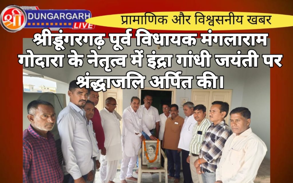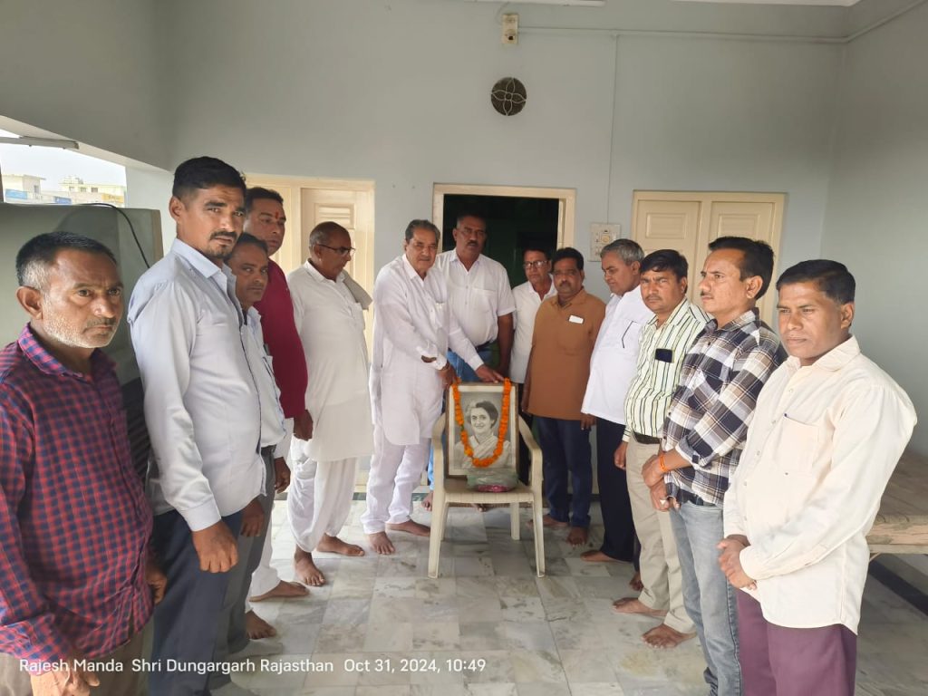 देश की एकता और अखंडता के लिए अपना सर्वस्व अर्पण करने वालीं इंदिरा गांधी की पुण्यतिथि पर आज कांग्रेस कार्यालय पर पूर्व विधायक मंगलाराम जी गोदारा के नेतृत्व में इंदिरा गांधी को पुण्यतिथि पर श्रंद्धाजलि अर्पित करी गई इस दौरान पूर्व विधायक ने कहा कि भारत की प्रथम महिला प्रधानमंत्री श्रीमती इंदिरा गांधी की शक्ति, समर्पण, साहस और सशक्त नेतृत्व की मिसाल हैं, इस सभा मे मनोज पारख, ओबीसी कांग्रेस ब्लॉक अध्यक्ष रमेश प्रजापत, पार्षद गण हीरालाल जाट,दाऊद काजी,रमेश बासनीवाल,यूसुफ चुनघर,प्रहलाद सोनी, रमेश व्यास, राजेश मंडा प्रकाश दुसाद, डूंगराराम गोदारा,राकेश सिद्ध, आदि मौजूद रहे।