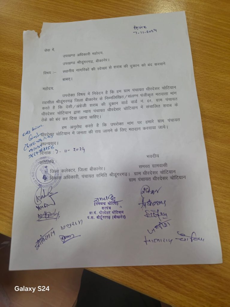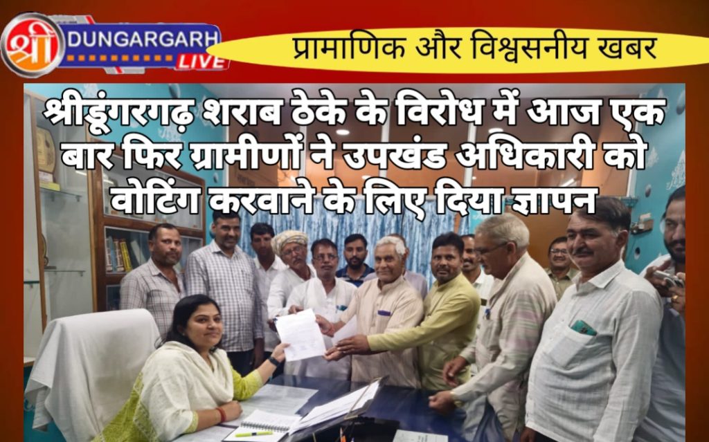 धीरदेशर चोटिया गांव में चल रहे शराब ठेके के विरोध में अब विरोध लगातार बढ़ता जा रहा है आज बड़ी संख्या में ग्रामीण श्याम सुंदर आर्य के नेतृत्व में उपखंड कार्यालय पहुंचे और उपखंड अधिकारी उमा मित्तल को एक ज्ञापन सोपा गया जिसमें वोटिंग करवाने की मांग की गई इसमें 1153 लोगों के साइन सहित ज्ञापन दिया गया है । ग्रामीण लगातार गांव में चल रहे शराब ठेके को बंद करवाने की आवाज उठा रहे हैं और गांव में धरना भी चल रहा है अब ग्रामीण गांव में शराब ठेके के खिलाफ वोटिंग करवाने की मांग प्रशासन से कर रहे हैं। ग्रामीणों में सरपंच रामचंद्र चोटिया,मालाराम चोटिया, सावरमल सहू, जगदीश आदि मौजूद रहे