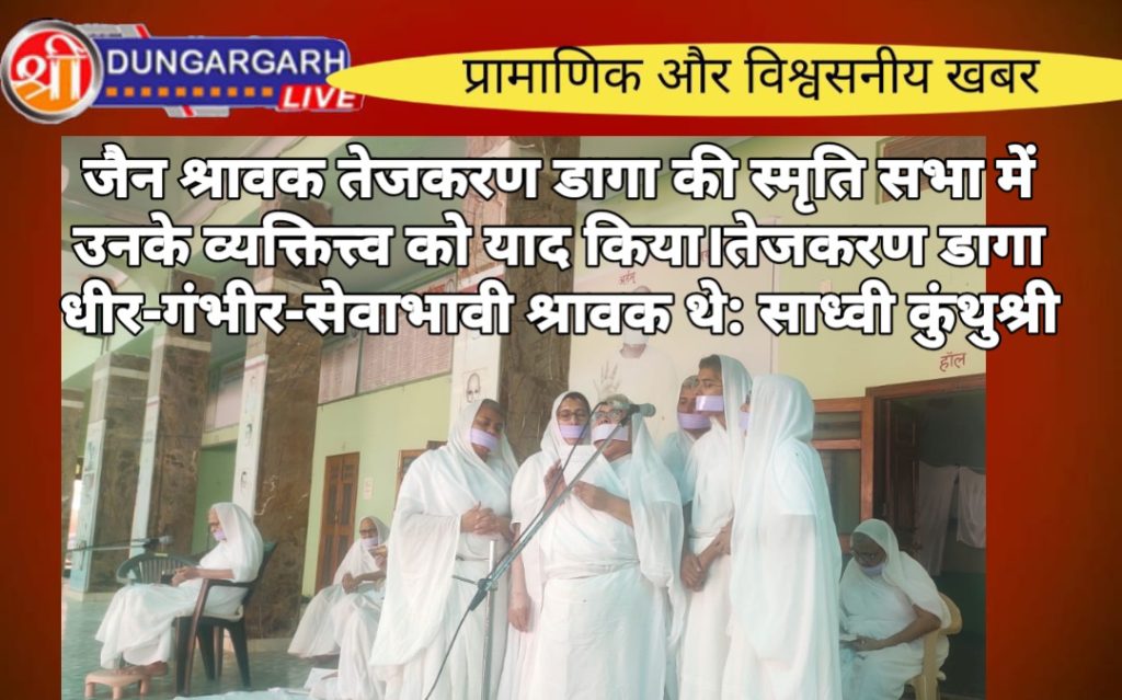 श्रीडूंगरगढ़। स्थानीय साध्वी सेवा केंद्र में सेवा केंद्र व्यवस्थापिका शासनश्री साध्वी कुंथुश्री के सान्निध्य में दिवंगत तेजकरण डागा की स्मृति सभा का आयोजन हुआ जिसमें साध्वी कुंथुश्री ने मृत्यु के बाद दिवंगत के सद्गुणों को आत्मसात करने की प्रेरणा और परिजनों को सम्बल देते हुए कहा कि सृष्टि का नियम है कि जो जीव जन्म लेगा उसकी मृत्यु अवश्यम्भावी है। तेजकरण डागा सभी संस्थाओं से जुड़े हुए व्यक्तित्व रहे हैं। उनके पास स्वयं का गंभीर चिंतन था। वो एक धीर, गंभीर , सेवाभावी और समझदार श्रावक थे। साध्वी ने कहा कि दिवंगत श्रावक तेजकरण डागा अपने कार्यों से संघ और समाज में एक सौरभ छोड़कर गए है। परिजन मृतक के पीछे आर्त्तध्यान करने के बजाय उनके गुणों की स्मृति करते हुए संघ और समाज में अपने समय व श्रम का नियोजन करते रहे। उनकी धर्मपत्नी दीपमाला डागा और उनकी माँ काफी विवेकशील और चिंतनशील महिला है। परिवार में धर्मध्यान का वातावरण बनाए रखे। दिवंगत तेजकरण डागा की स्मृति सभा में साध्वी प्रमुखा विश्रुतविभा के संदेश का वाचन हरीश डागा, साध्वी संगीतश्री और साध्वी कनकरेखा के संदेश का वाचन विनीता डोसी और साध्वी सुप्रभा के संदेश का वाचन अजय चौरड़िया(सुजानगढ़) ने किया। साध्वियों द्वारा दिवंगत तेजकरण डागा की स्मृति में गीतिका का संगान किया गया। साध्वी सुमंगला, साध्वी सम्पतप्रभा, साध्वी ऋजुप्रज्ञा, साध्वी सुलेखा, साध्वी जीतयशा और साध्वी पुनीतप्रभा ने विचार व्यक्त करते हुए दिवंगत की सेवाओं का उल्लेख किया।