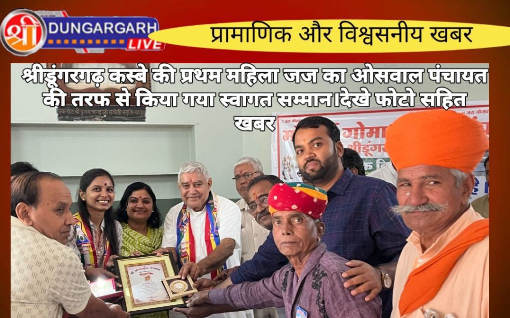 श्रीडूंगरगढ़ कस्बे की प्रथम महिला जज बनने का गौरव प्राप्त करने वाली महिमा दुगड़ ओसवाल समाज की संस्था श्री ओसवाल पंचायत द्वारा स्वागत सम्मान किया गया। इस दौरान विधायक ताराचन्द सारस्वत, एसडीएम उमा मित्तल, माँ दुर्गा गौमाता सेवा संघ के अध्यक्ष सुरेंद्र सुराणा, संयोजक प्रेम प्रकाश कुण्डलिया, भाजपा शहर अध्यक्ष महावीर अड़ावलिया, भाजपा वरिष्ठ कार्यकर्ता लीलाधर बोथरा और श्री ओसवाल पंचायत अध्यक्ष विनोद भादानी मंचस्थ रहे। समागत अतिथियों का श्री ओसवाल पंचायत की ओर से दुपट्टा पहनाकर स्वागत किया गया। तत्पश्चात आरजेएस महिमा दुगड़ का प्रशस्ति पत्र सहित रजत निर्मित पेन सहित अन्य उपहार देकर स्वागत किया गया। इस दौरान पार्षद अशोक बैद, प्रवीण डागा, प्रकाश सिंघी, नवरत्न बुच्चा, गौरव बोथरा, मनीष बोथरा, हनुमान दुगड़, निर्मल पुगलिया, मनीष पटावरी, सत्यनारायण स्वामी, वरिष्ठ पत्रकार तोलाराम मारू, कमल बोथरा सहित अनेकों गणमान्य नागरिक मौजूद रहे। कार्यक्रम का संचालन राजू हिरावत ने किया। इस दौरान माँ दुर्गा गौमाता सेवा संघ द्वारा सड़क दुर्घटनाओं में गायों की मृत्यु रोकने के उद्देश्य के साथ रेडियम बेल्ट लगाने का शुभारंभ किया गया।