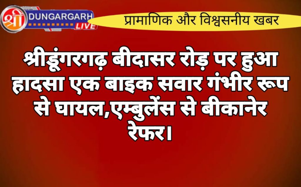 श्रीडूंगरगढ़ में हादसे रुकने का नाम नहीं ले रहे हैं बीदासर रोड पर रिडी गांव के पास एक बाइक सवार को अज्ञात वाहन ने टक्कर मार दी जिससे बाइक सवार युवक गंभीर रूप से घायल हो गया। घटना की जानकारी मिलने पर एपीजे अब्दुल कलाम वेलफेयर सोसाइटी की एंबुलेंस मौके के लिए रवाना हुई और रास्ते में दूसरे वाहन से लाकर युवक को उप जिला अस्पताल पहुंचाया गया जहां उसकी हालत गंभीर होने पर इसी एंबुलेंस से पीबीएम ट्रॉमा सेंटर रेफर कर दिया गया है