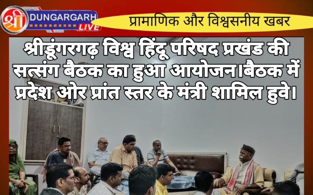 विश्व हिंदू परिषद प्रखंड की एक सत्संग बैठक का आयोजन बजरंग दल जिला संयोजक वासुदेव जी के घर पर किया गया।बैठक में अखिल भारतीय सह सत्संग प्रमुख श्री महेंद्र भाई(दादा) वैधक और प्रांत मंत्री श्री परमेश्वर जी शामिल हुवे।बैठक में सत्संग करने पर काफी कुछ ऊर्जावान बाते दादा भाई ने बताई, उन्होंने अपने व्यक्तव्य में कहा की आज हर इंसान तनावपूर्ण स्थिति में अपना जीवन यापन कर रहा है, ऐसे में सिर्फ हरि भजन और सत्संग से ही जीवन में सुख,शांति और समृद्धि को प्राप्त कर सकता है।उन्होंने लगभग एक घंटे चली बैठक में काफी भजनों का उच्चारण भी करवाया और कहा की इस वक्त पूरे भारत में लगभग 30000 साप्ताहिक सत्संग केंद्रों पर सत्संग का आयोजन निरंतर हो रहा है, साथ ही बताया की अपने आप को ईश्वर से जोड़ो तभी स्वयं का कल्याण हो सकता है। उन्होंने स्वामी विवेकानन्द के बारे में बताया कि कैसे रामकृष्ण परमहंस जैसे गुरु ने नरेंद्र को विवेकानन्द बनाया और समग्र विश्व के कल्याण के मार्ग को प्रशस्त किया।प्रांत मंत्री महोदय ने भी काफी ओज पूर्ण व्यक्तव्य दिया ।बैठक में संरक्षक भंवर जी दुगड़,जिला अध्यक्ष जगदीश जी स्वामी,बजरंग दल जिला संयोजक वासुदेव सारस्वत,प्रखंड अध्यक्ष श्याम जी जोशी,उपाध्यक्ष अशोक जी नाई,प्रखंड मंत्री दीपक सेठिया,नगर मंत्री मनीष नौलखा, धर्म जागरण प्रमुख अशोक जी बेद, गौ रक्षा प्रमुख भीखाराम जी सुथार, प्रशासन प्रमुख फतेह सिंह जी जांगिड़,सत्संग प्रमुख त्रिलोक जी प्रजापत, सदस्य गोपाल चुरा,बजरंग मूंदड़ा आदि अनेक सदस्य मौजूद रहे। अंत में जिला अध्यक्ष महोदय ने सभी का आभार व्यक्त करते हुए भारत माता की जय जयकार के साथ बैठक समाप्ति की घोषणा की।