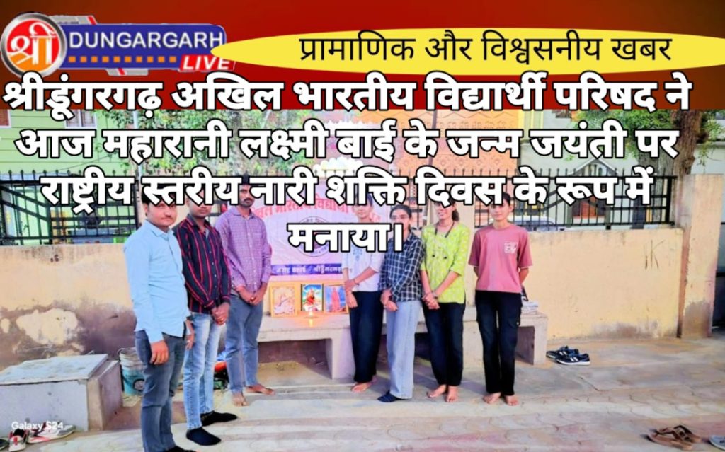 आज अखिल भारतीय विद्यार्थी परिषद श्रीडूंगरगढ़ द्वारा महारानी लक्ष्मी बाई के जन्मजयंती पर राष्ट्रीय स्तर के कार्यक्रम पर नारी शक्ति दिवस के रूप में मनाया। अखिल भारतीय विद्यार्थी परिषद नगर मंत्री लालचन्द मेघवाल के नेतृत्व में जिसमें बीकानेर भाग संयोजक प्रवीण गुसाई का प्रवास रहा उन्होंने महारानी लक्ष्मी बाई की जीवनी के बारे में बताया,पूर्व नगर मंत्री राज सारस्वत, किशन शर्मा नगर इकाई खेल संयोजक तथा परिषद के कार्यकर्ता बसंती लांबा ,कांता लाबा आदि मौजूद रहे