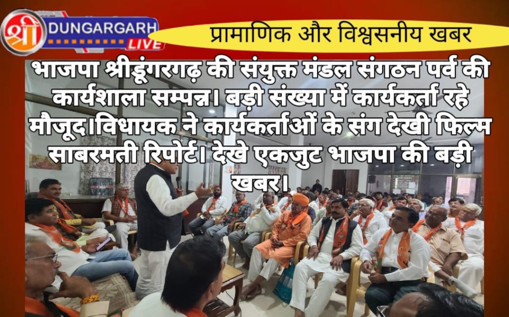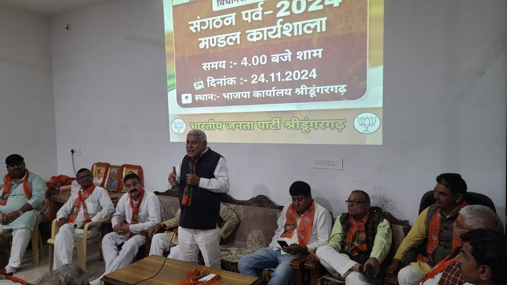 आज श्रीडूंगरगढ़ भाजपा कार्यालय पर संगठन पर्व एवं सक्रियता अभियान 2024 को लेकर भारतीय जनता पार्टी श्रीडूंगरगढ़ ने रविवार को चारों मंडलों की संयुक्त कार्यशाला का आयोजन किया ।कार्यशाला में मुख्य अतिथि विधायक ताराचंद सारस्वत व मुख्यवक्ता संगठन चुनाव सह प्रभारी जिला बीकानेर रामेश्वर पारीक एवं अतिथि मण्डल संगठन पर्व प्रभारी एवं जिलामंत्री देवीलाल मेघवाल शामिल हुए। कार्यशाला में संगठन पर चर्चा की गई और 30 नवंबर तक सभी बूथों पर बूथ कमेटी बनाने की बात कही गई। इस दौरान देवीलाल मेघवाल ने बताया कि बूथ कमेटी में बूथ अध्यक्ष, बूथ मंत्री, लाभार्थी प्रमुख, मन की बात प्रमुख, व्हाट्सएप ग्रुप प्रमुख,बीएलए टू समेत कुल 11 सदस्य होगे। इस दौरान रामेश्वर पारीक ने कार्यकर्ताओं को ज्यादा से ज्याद संख्या में भाजपा का सदस्य बनाने एवं जिसके कम से कम 50 सदस्य बना लिए उन्हें सक्रिय सदस्य बनने का आव्हान किया। इस अवसर पर विधायक ताराचंद सारस्वत ने बुथ समिति लोकतांत्रित तरीके से सर्वस्पर्शी एवं सर्व समावेशी होने की बात कही। पुनर्गठन में प्राथमिक सदस्य, सक्रिय सदस्य, बूथ कमेटी, शक्ति केंद्र व मंडल स्तर पर कमेटी का विस्तार शामिल है। साथ ही विधायक सारस्वत ने कार्यशाला में पार्टी को मजबूत बनाने का आव्हान किया तथा एक रहने का संदेश दिया। इस दौरान मंच संचालन शहर महामंत्री सुरेंद्र चुरा ने किया. अल्पसंख्यक मोर्चा जिलाध्यक्ष इमरान राईन ने सभी कार्यकर्ताओं को महाराष्ट्र और राजस्थान में ऐतिहासिक जीत पर लड्डू खिलाकर बधाई दी ।