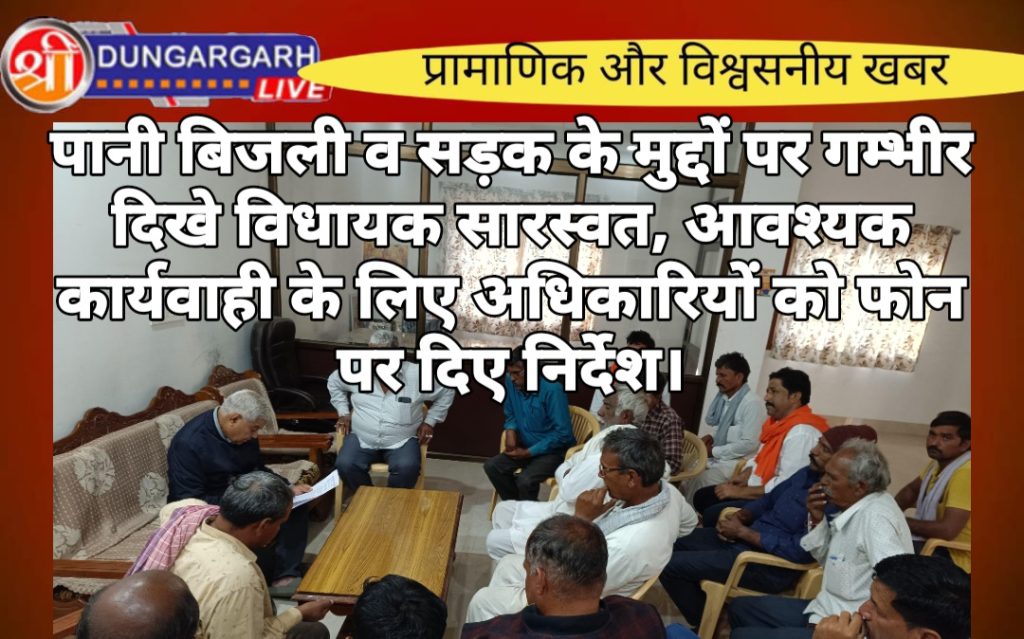 श्रीडूंगरगढ़ यहां विधायक लोक सेवा केंद्र पर सोमवार को विधायक ताराचन्द सारस्वत ने आम जनता के साथ सवांद कर जनसुनवाई की। इस दौरान तहसील के गांवो से पहुंचे लोगों ने विधायक को विभन्न समस्याओं से अवगत करवाया। विधायक ने समन्धित विभाग को फोन के माध्यम से हर समस्या के समाधन के निर्देश दिए। इस दौरान पानी,बिजली व सड़क सम्बंधित समस्याओं पर चर्चा की है। विधायक के निजी सहायक रजनीकांत सारस्वत ने बताया कि कस्बे में साफ सफाई सहित रोड़ लाइट के कार्य चल रहे है। विभन्न समस्याओं का समाधन कर दिया गया। जनसुनवाई में करीब डेढ़ सौ से अधिक लोगों मौजूद रहें।