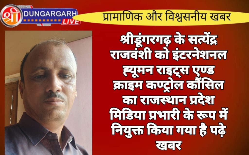 श्रीडूंगरगढ़ के सत्येंद्र राजवंशी को इंटरनेशनल ह्यूमन राइट्स एण्ड क्राइम कण्ट्रोल कौंसिल का राजस्थान प्रदेश मिडिया प्रभारी के रूप में नियुक्त किया गया है, उनका मुख्य उदेश्य मिडिया जगत के हितों की रक्षा करना और मिडिया बंधुओ के कल्याण के लिए प्रभावी रूप से आवाज उठाना है। वे मिडिया से जुड़े मुद्दों पर जागरूकता बढ़ाने और सुरक्षा सुनिश्चित करने के लिए समर्पित है। संस्था प्रमुख डॉ वी पी सिंह और राष्ट्रीय अध्यक्ष एडवोकेट आर वी मेहता में सत्येंद्र राजवंशी को निर्देश दिया है की वे IHRCCC के उद्देश्यों के अनुरूप काम करते हुए समाज और मिडिया के हितों की रक्षा करें। सत्येंद्र राजवंशी अपनेबनये दायित्वों को पूरी निष्ठा और ईमानदारी से निभाएंगे. डॉ वी पी सिंह और एडवोकेट आर वी मेहता ने उम्मीद जताई की उनकी नियुक्ति से मिडिया क्षेत्र से सकारात्मक बदलाव आएंगे। सत्येंद्र राजवंशी की ये नियुक्ति 28 दिसम्बर 2024 को दिल्ली में आयोजित होने वाले ऑनर सेरेमनी में पद की शपथ लेने के बाद ही प्रभावी मानी जाएगी। पद और कर्तव्यों की शपथ के बाद ही उनकी नियुक्ति को औपचारिक रूप से मान्यता दी जाएगी।