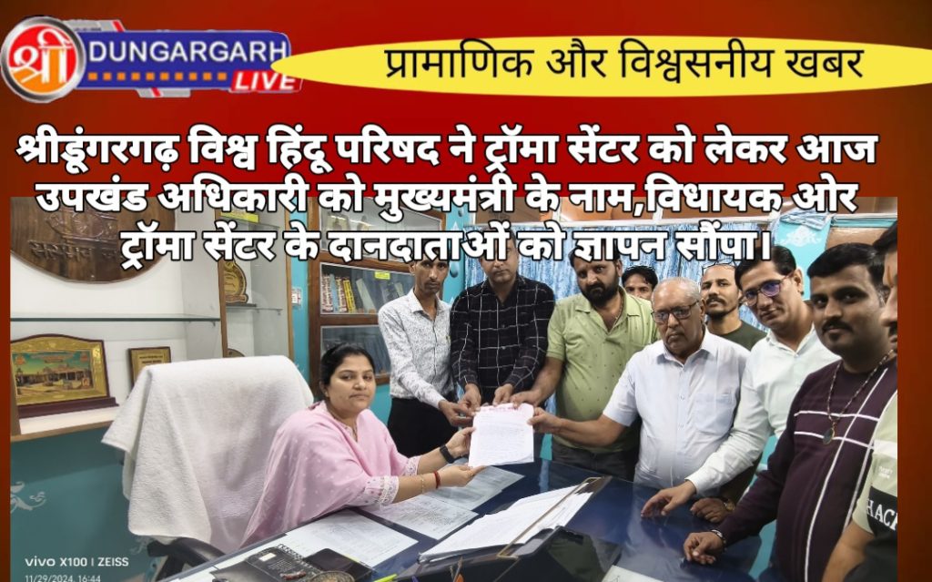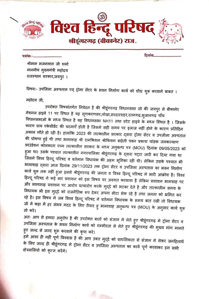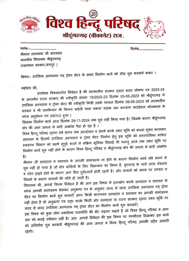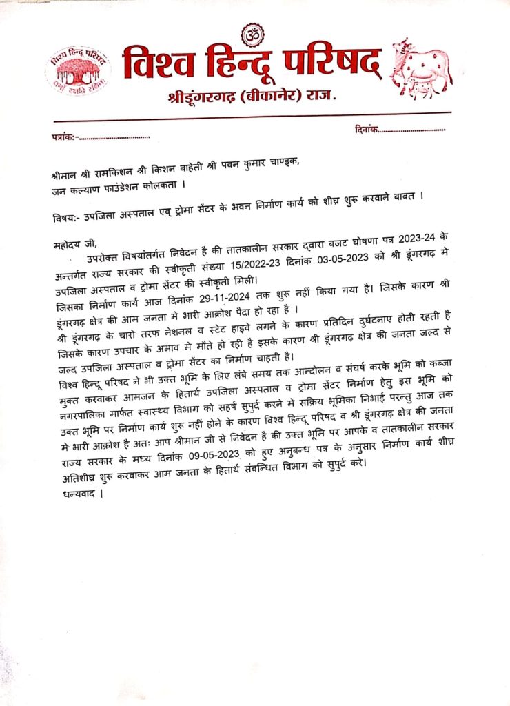 विश्व हिंदू परिषद द्वारा उपजिला अस्पताल एवं ट्रॉमा सेंटर के भवन निर्माण कार्य को शीघ्र शुरू करवाने के लिए आज तीन अलग-अलग ज्ञापन सौंपे गए। परिषद ने यह ज्ञापन विधायक ताराचंद सारस्वत, मुख्यमंत्री भजनलाल शर्मा के नाम उपखण्ड अधिकारी उमा मित्तल, तथा जनकल्याण फाउंडेशन कोलकाता के भामाशाह रामकिशन श्रीकिशन बाहेती एवं पवन प्रकाश चांडक को सौंपा है। ज्ञापन में बताया गया कि वर्ष 2023-24 के बजट में तात्कालीन सरकार द्वारा श्रीडूंगरगढ़ में उपजिला अस्पताल एवं ट्रॉमा सेंटर के निर्माण की घोषणा की गई थी। इसके लिए 3 मई 2023 को राज्य सरकार द्वारा स्वीकृति जारी की गई और 9 मई 2023 को जनकल्याण फाउंडेशन कोलकाता के साथ एक अनुबंध (डव्न्) पर हस्ताक्षर किए गए। इसके बावजूद, आज तक निर्माण कार्य प्रारंभ नहीं हो पाया है।