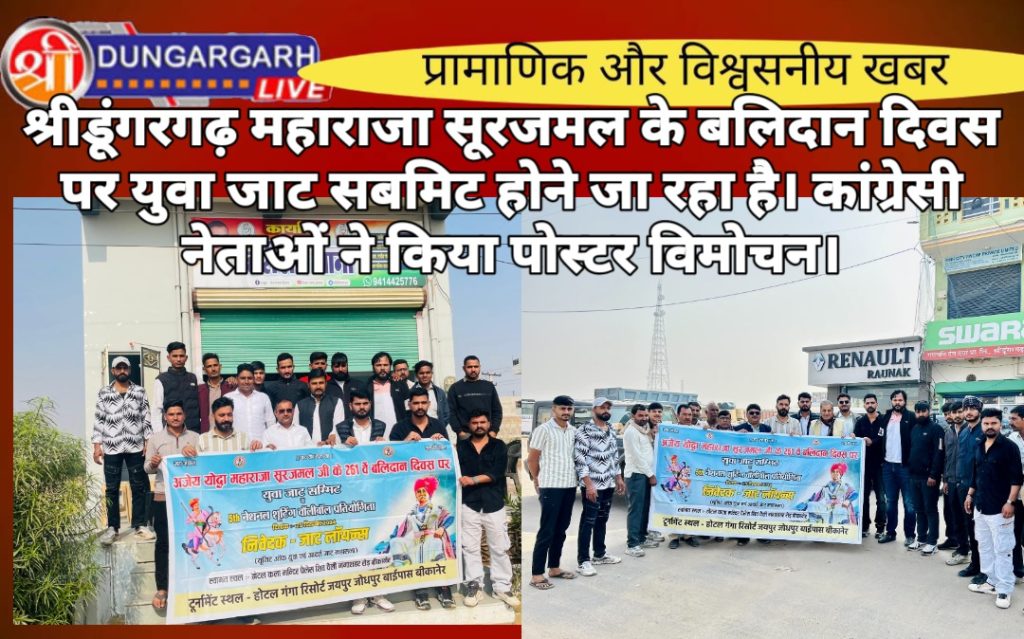 महाराजा सूरजमल जी के 261 वें बलिदान दिवस 25 दिसंबर 2024 को आदर्श जाट महासभा एवं जाट लायंस की तरफ से युवा- जाट- सम्मिट- 24 एवं वॉलीबॉल प्रतियोगिता का होने जा रहे इस भव्य आयोजन के लिए पूर्व विधायक मंगलाराम गोदारा, प्रधान प्रतिनिधि केसराराम गोदारा,युवा टीम के साथ हरीराम बाना (पीसीसी सदस्य),लकी चौधरी( प्रदेशाध्यक्ष जाट लॉयंस), राजेश गाट ( ज़िलाध्यक्ष जाट लॉयंस) , मुकेश जाखड़ और जाट लायन्स टीम द्वारा पोस्टर विमोचन किया गया।सभी जाट बन्धु 25 दिसंबर सुबह 10:30 बजे होटल कला मंदिर शिव वैली,गंगा शहर बीकानेर में इस आयोजन में शामिल होकर कार्यक्रम की शोभा ओर ताकत बढ़ाएं.
