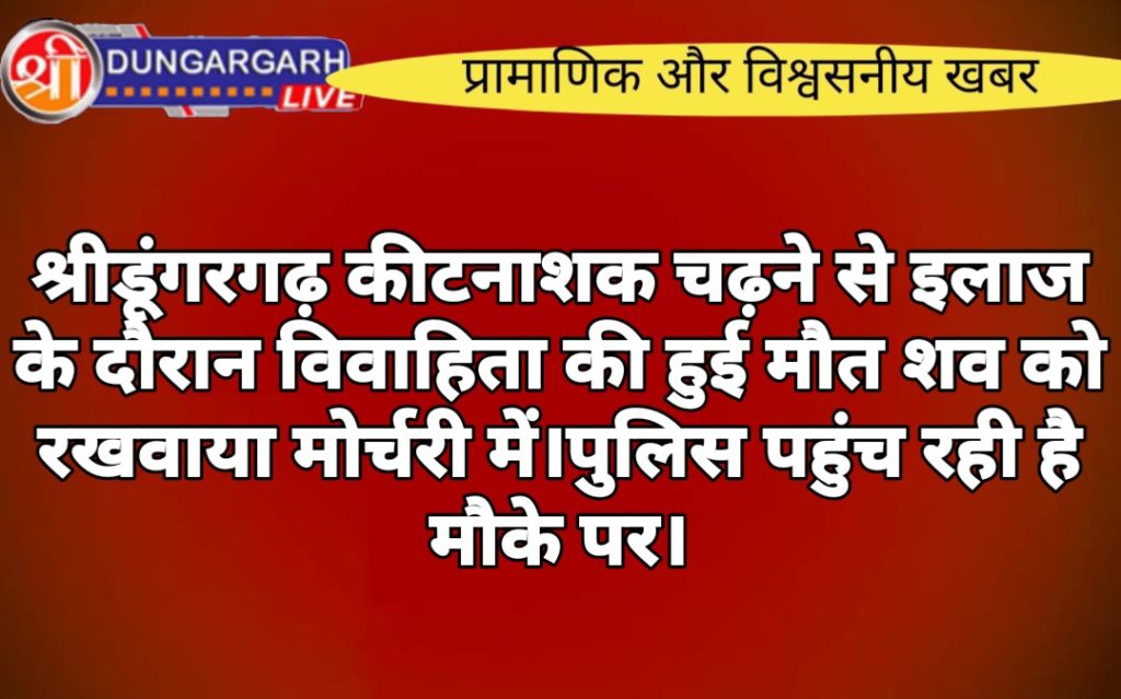 श्रीडूंगरगढ़ क्षेत्र से दुखद खबर कीटनाशक चढ़ने से एक विवाहिता की दर्दनाक मौत हो गई मिली जानकारी के अनुसार बिग्गा बास निवासी सुमन पत्नी सतपाल को कीटनाशक चढ़ने पर पीबीएम ट्रॉमा सेंटर ले जाया गया जहां इलाज के दौरान उसकी मौत हो गई। घटना की जानकारी मिलने पर श्री डूंगरगढ़ पुलिस थाने से हेड कांस्टेबल लक्ष्मण नेहरा पीबीएम के लिए रवाना हो गए हैं जहां शव का पोस्टमार्टम करवाकर परिजनों को सुपर्द किया जाएगा