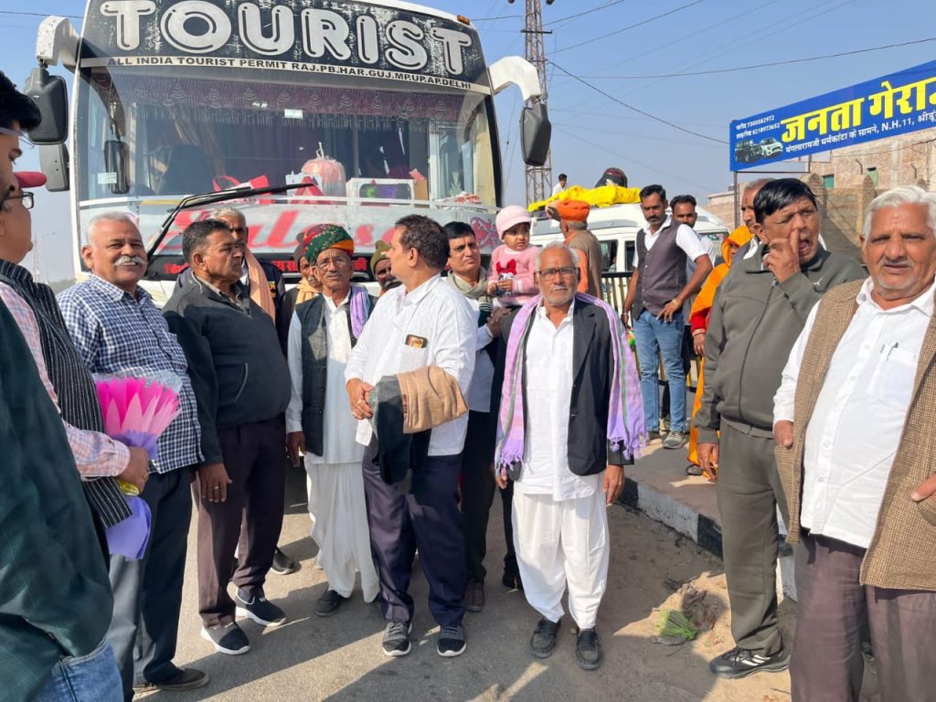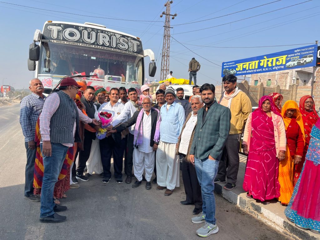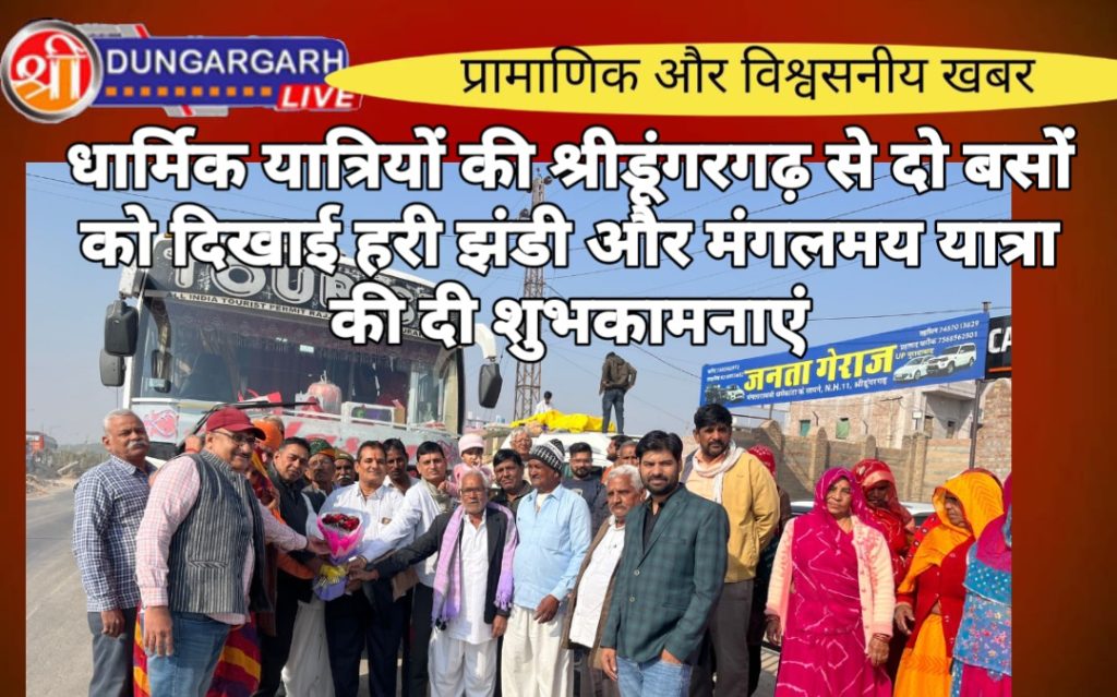 श्रीडूंगरगढ़ से 65यात्रियों का ग्रुप धार्मिक यात्रा पर रवाना हुआ जिसमें दो बसों में यात्रिगण रवाना हुवे श्रीडूंगरगढ़ से एक महीने की इस धार्मिक में रवाना हुए यात्री :-कुरुक्षेत्र, हरिद्वार, ऋषिकेस, अयोध्या, जनकपुरी, पसुप्तिनाथ (काठमांडू )नेपाल, गयाजी (बिहार )कलकत्ता गंगासागर (पश्चिम बंगाल )नेमिशरान, जगनाथ पूरी (उड़ीसा )वैजनाथ धाम (झारखण्ड )काशीविश्वनाथ (उत्तर प्रदेश )प्रयागराज, मथुरा कृष्णजन भूमि सहित सेकड़ो धार्मिक स्थानों क़े दर्शन व स्नान करके एक महीने की धार्मिक यात्रा सम्पन्न करेंगे । सभी धर्म-प्रेमियों को विधायक ताराचंद जी सारस्वत की तरफ से विधायक सेवा केन्द्र से पहुंचे भाजपा शहर महामंत्री महेश राजोतिया व युवा मोर्चा जिला उपाध्यक्ष भवानी प्रकाश तावणीया ने गुलदस्ता भेंट करके सभी धार्मिक-यात्रियों को मंगलमय यात्रा की शुभकामनायें दी । यात्रीगण में हेमनाथ जाखड़,चम्पा लाल प्रजापत, नानूराम कुचेरिया,प्रेम सुख प्रजापत, कुशलनाथ गोदारा, ओम प्रकाश डूडी, दीनदयाल सोनी, सुखाराम प्रजापत, लिछू राम, करणी सिंह राजपूत, उदय भान सिरडिया,भागुनाथ सिद्ध, रामानंद प्रजापत, प्रभु राम घिटाळा सहित महिलाओ का जथा भी साथ में रवाना हुवा जय हो गंगा माई की जय हो ।