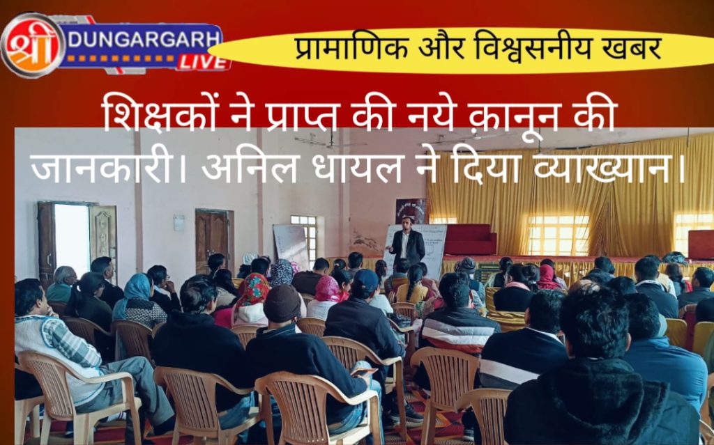 शिक्षा विभाग द्वारा तेजा मंदिर सभागार के प्रांगण में शिक्षकों के लिए आयोजित प्रशिक्षण शिविर में एडवोकेट अनिल धायल ने कानूनी जानकारियां दी। धायल ने नए कानून भारतीय न्याय संहिता के विषय में विस्तृत जानकारी दी। उन्होंने अधिकारों का वर्णन करते हुए कर्तव्यों के बारे में बताया और दंड व्यवस्था के कठोर किए जाने की बात कही। धायल ने बताया कि नए कानून जरूरतमंद तक शीघ्र न्याय देने का प्रयास भी है। इस दौरान प्रश्नोत्तरी काल का आयोजन हुआ जिसमें शिक्षकों की कानून संबंधी शंकाओ का निस्तारण भी किया गया। कार्यशाला में शिवभगवान नाई, धर्मवीर, प्रिया विश्नोई, सतवीर पूनियां, शैल खत्री, पूर्णचंद, मनोज दुबे, मनोज लखारा, लक्ष्मीनारायण भादू, पवन गोयतान, रामावतार शर्मा, नौरंगनाथ सहित अनेक शिक्षक व शिक्षिकाएं मौजूद रही।