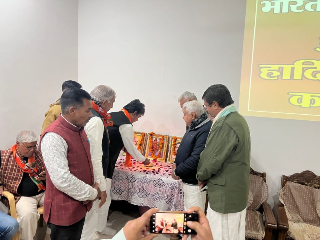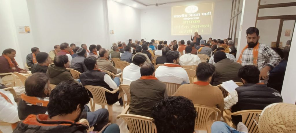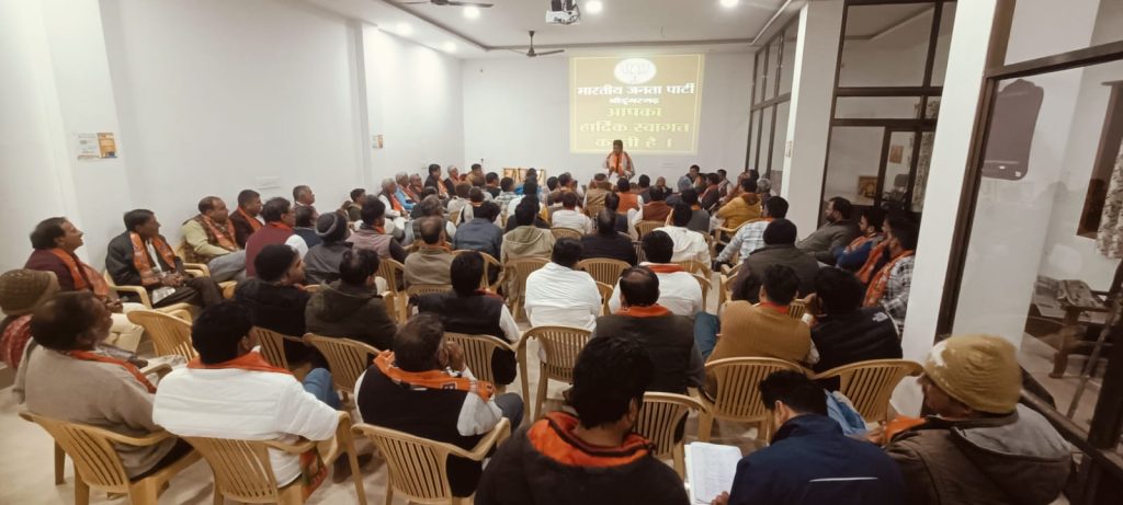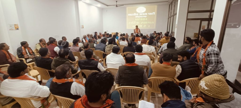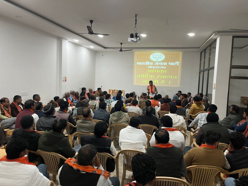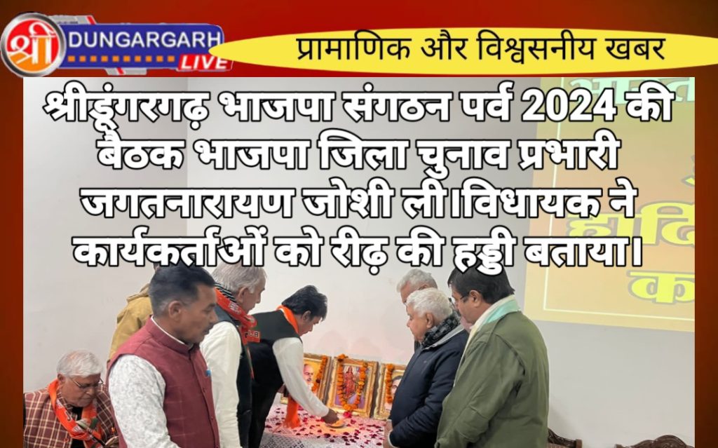भारतीय जनता पार्टी कार्यालय श्रीडूंगरगढ़ में आज संगठन पर्व 2024 की मीटिंग हुई जिसमें भारत माता, पं.दीनदयाल उपाध्याय, डॉ.श्यामा प्रसाद मुखर्जी के चित्र पर माला अर्पित कर द्वीप प्रज्वलन करके मीटिंग की शुरुआत की । इसके बाद श्रीडूंगरगढ़ विधायक ताराचंद सारस्वत ने प्रवास कार्यक्रम में पधारे जिला चुनाव प्रभारी एवं जोधपुर से पूर्व जिलाध्यक्ष जगतनारायण जोशी तथा जोधपुर पूर्व ज़िला महामंत्री संजय दहिया को साफा तथा राजस्थान विश्वकर्मा कौ.वि. बोर्ड अध्यक्ष रामगोपाल सुथार ने शॉल पहनाकर स्वागत अभिनंदन किया। मीटिंग में जिला चुनाव प्रभारी जगतनारायण जोशी ने पार्टी संगठन पर्व के बारे में बताते हुए आगामी संगठन गतिविधियों के बारे में सामूहिक और मण्डल वाइस व्यक्तिगत चर्चा की । विधायक ताराचंद सारस्वत ने कार्यकर्ताओं को रीढ़ की हड्डी बताते हुए पार्टी और संगठन के निर्देशन में कार्य करने की प्रेरणा दी । राजस्थान विश्वकर्मा कौशल बोर्ड के अध्यक्ष रामगोपाल सुथार ने पार्टी को मजबूती से आगे बढ़ाने की बात कही । भाजपा ज़िला चुनाव सह प्रभारी रामेश्वरलाल पारीक ने संगठन पर्व की गतिविधियों के बारे में बताया,जिला महामंत्री श्याम पंचारिया ने पार्टी के संगठन के बारे में जानकारी देते हुए श्रीडूंगरगढ़ विधानसभा क्षेत्र के संगठन कार्य की तारीफ़ की तथा ज़िला उपाध्यक्ष शिव स्वामी ने पार्टी के संगठन को सर्वोपरि बताया। इस दौरान चेयरमैन मानमल शर्मा,शहर मण्डल अध्यक्ष महावीर प्रजापत, देहात मंडल अध्यक्ष महेन्द्र सिंह तंवर, मोमासर मण्डल अध्यक्ष शिव जोशी, बापेऊ मण्डल अध्यक्ष गिरधारीलाल गोदारा,विधानसभा संयोजक लीलाधर बोथरा सहित पार्टी के चारों मण्डल के पदाधिकारी,जनप्रतिनिधि एवं कार्यकर्तागण शामिल हुए। मीटिंग का संचालन महामंत्री सुरेन्द्र चुरा ने किया।