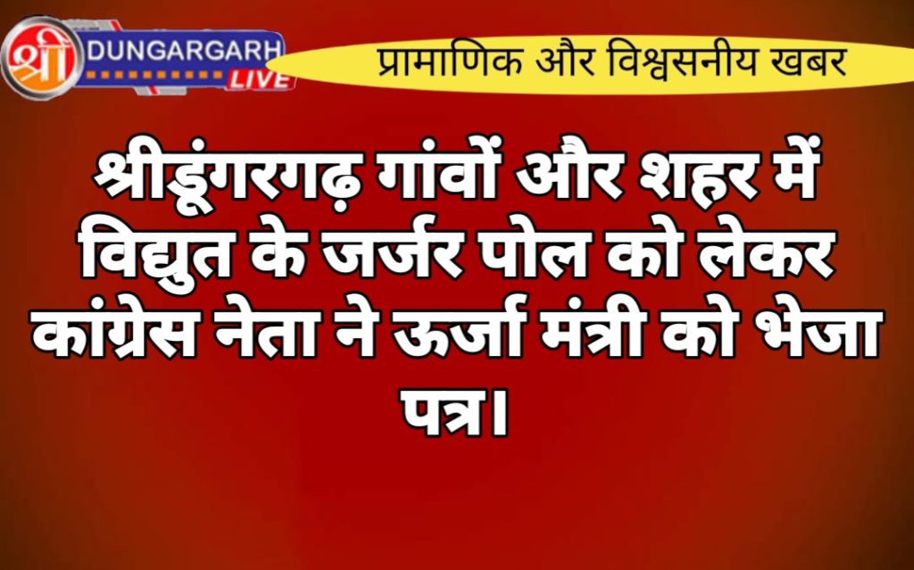 कांग्रेस के नेता हरीराम बाना ने श्रीडूंगरगढ़ शहर व गांवो में विद्युत विभाग के लोहे के पोल, सीमेंट के जर्जर पोलों को बदलने व झूलते तारों को ठीक करवाने की मांग करते हुए ऊर्जा मंत्री को पत्र भेजा है। बाना ने बताया कि क्षेत्र में लोहे के पोल से आने वाले करंट के कारण बेजुबानों के मरने की अनेक घटनाएं हो रही है। वहीं झूलते तार व सीमेंट के जर्जर पोल भी परेशानी का कारण बने हुए है। बाना ने उपखंड अधिकारी सहित विभागीय अधिकारियों को पत्र भेजकर ऐसे पोल चिह्नित कर उन्हें अतिआवश्यक कार्य में लेकर बदलवाने की मांग की है।
