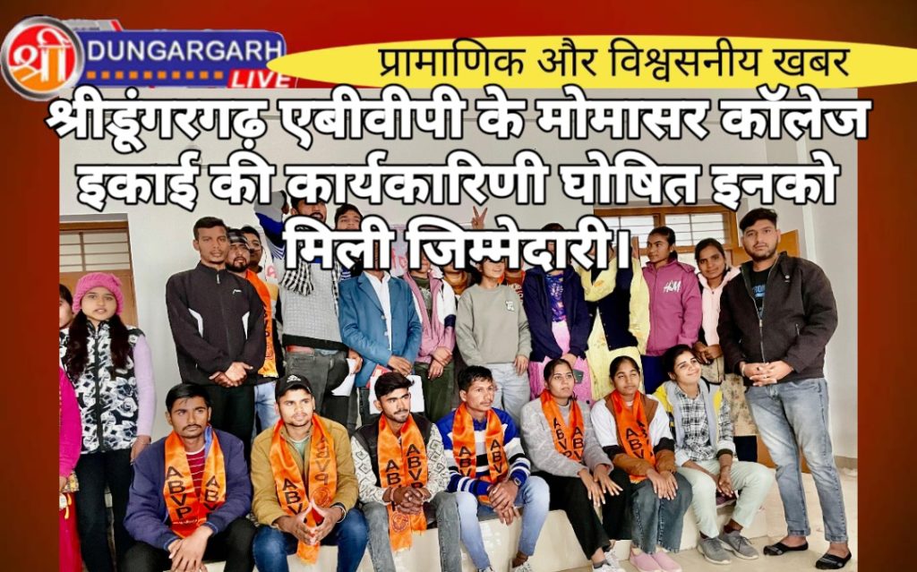 अखिल भारतीय विद्यार्थी परिषद द्वारा मोमासर कॉलेज इकाई में कार्यकारिणी की घोषणा की गई। जिसमें सर्वप्रथम मां सरस्वती और स्वामी विवेकानंद जी को दीप प्रज्वलित करके कार्यक्रम की शुरुआत की गई। इस कार्य क्रम में जिला भाग संयोजक प्रवीण गोसाई प्रवास पर रहे जिन्होंने एबीवीपी की रीति नीति के बारे में बताया तथा 5,6,7 जनवरी को पाली में 60 वा प्रांत अधिवेशन होगा जिसमें सभी दायित्वान कार्यकताओं को अधिवेशन में चलने का आग्रह किया । इसमें श्रीडूंगरगढ़ नगर इकाई नगर मंत्री लालचंद मेघवाल ने ABVP की कार्यशैली के बारे में बताया युवों के प्रेरणास्रोत स्वामी विवेकानन्द जी के चरणों में नमन वह मां सारदा नमन वह वंदन एबीवीपी की स्थापना 9 जूलाई 1949 में हुई एबीवीपी मूल उद्देश्य राष्ट्र का पुनः निर्माण करना है कहा देश वह विश्व का सबसे बड़ा राष्ट्र संगठन है छात्र शक्ति ही राष्ट्र शक्ति है ज्ञान शील एकता यह ही परिषद् की विशेषता है आज का छात्र ही कल का नागरिक है अनेकों कार्य पर चर्चा की ।