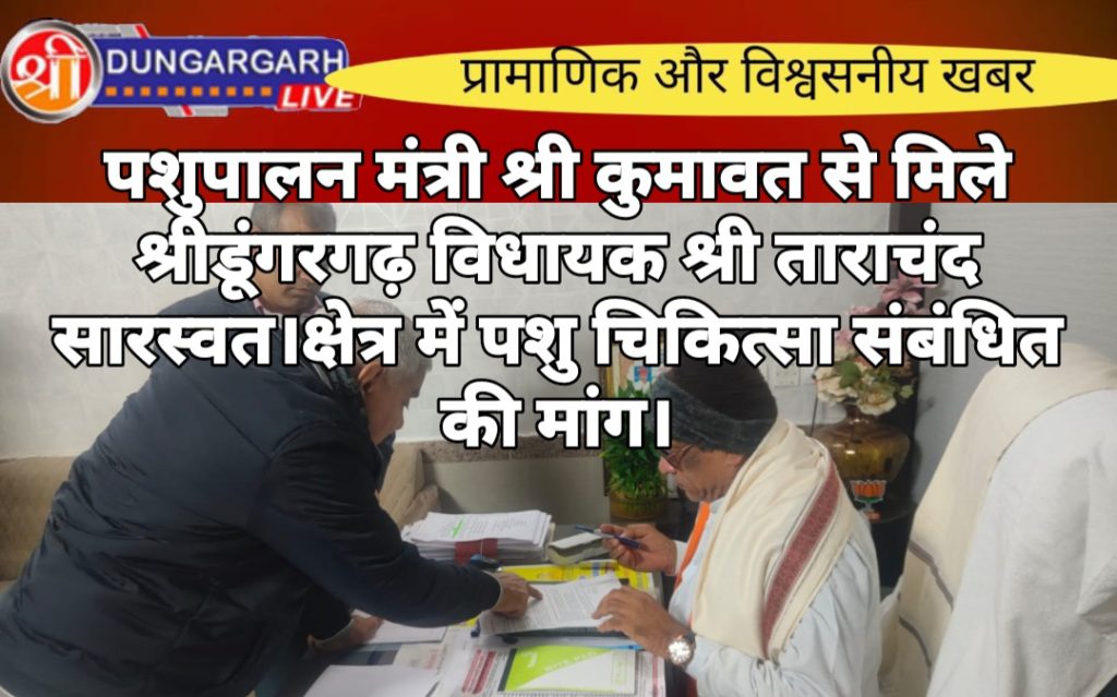 श्रीडूंगरगढ़ विधायक श्री ताराचंद सारस्वत ने मंगलवार को जयपुर में पशुपालन एवं गोपालन मंत्री श्री जोराराम कुमावत से मुलाकात की। उन्होंने श्रीडूंगरगढ़ विधानसभा क्षेत्र में पशु चिकित्सा से संबंधित सुविधाओं एवं सेवाओं का विस्तार करने के लिए नए पशु अनुसंधान केन्द्र और पशु प्रजनन केन्द्र खुलवाने की मांग की। विधायक ने कहा कि श्रीडूंगरगढ़ विधानसभा क्षेत्र के अधिकांश निवासी ग्रामीण क्षेत्रों में निवास करते हैं। इस क्षेत्र में 100 से अधिक गांव हैं। जिनका मुख्य कार्य खेती एवं पशुपालन से संबंधित है। ग्रामीण क्षेत्र में पशुपालन और खेती कार्य आजीविका का प्रमुख साधन है। साथ ही पशुपालन को सेवा के रूप में भी करते हैं। उन्होंने बताया कि क्षेत्र में विभिन्न तरह के पशुधन हैं। इसके मद्देनजर श्रीडूंगरगढ़ क्षेत्र के पशुपालकों के लिए पशु अनुसंधान केन्द्र और पशु प्रजनन केन्द्र खुलवाना जरूरी है। उन्होंने आड़सर बास के प्रथम श्रेणी पशु चिकित्सालय को वेटरनरी पॉली क्लीनिक में क्रमोन्नत करवाने, गुसाईसर बड़ा व इसके आसपास क्षेत्र में राठी गायों की अधिक संख्या को देखते हुए पशु चिकित्सा उपकेन्द्र गुसाईसर बड़ा को प्रथम श्रेणी पशु चिकित्सालय में क्रमोन्नत करवाने, पशु उपकेन्द्र आडसर, सेरूणा और धर्मास को पशु चिकित्सालय में क्रमोन्नत करवाने का आग्रह किया। विधायक ने पशु चिकित्सालय रीडी एवं लखासर को प्रथम श्रेणी चिकित्सालय में क्रमोन्नत करने, भेड़ ऊन विभाग की रिक्त 10 बीघा भूमि पर चार दीवारी निर्माण कार्य करवाने, श्रीडूंगरगढ़ क्षेत्र के समस्त पशु चिकित्सालयों एवं पशु उपकेन्द्रों में रिक्त पदों को भरवाने और पशुपालन, प्रजनन, सेवा एवं सामान्य उपचार की जानकारी एवं प्रशिक्षण के लिए श्रीडूंगरगढ़ विधानसभा क्षेत्र में सुविधाओं और सेवा प्रशिक्षण केन्द्रों की स्थापना करवाने का आग्रह किया।