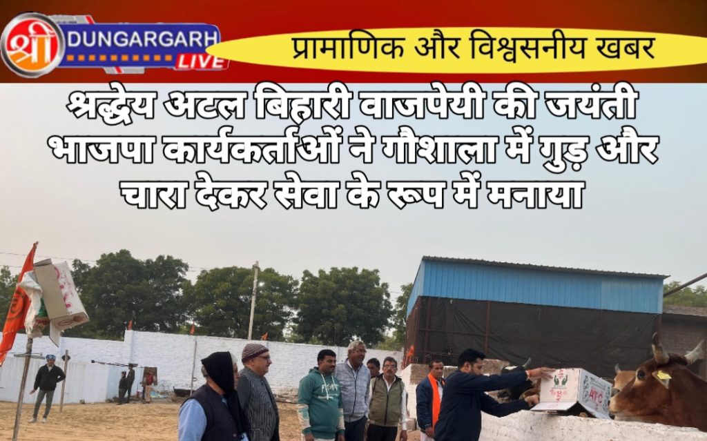 भारतरत्न श्रद्धेय श्री अटल बिहारी वाजपेयी की जयंती पर भाजपा कार्यकर्ताओं ने श्रीडूंगरगढ़ में श्री परमार्थ बाल गोपाल गौशाला में बछड़ों को गुड़ और चारा देकर सेवा कार्य के रूप में मनाया ।अपने दृढ़ निश्चय, अडिग संकल्प व कुशल नेतृत्व से अजेय, अभेद्य एवं अटल भारत की नींव रखने वाले, भारत रत्न से विभूषित पूर्व प्रधानमंत्री श्रद्धेय श्री अटल बिहारी वाजपेयी जी की जयंती ‘सुशासन दिवस’ के अवसर पर उन्हें पुष्पांजलि अर्पित कर भावपूर्ण नमन किया।गौपाल गौशाला में सेवा कार्य में भाजपा मण्डल अध्यक्ष महावीर प्रजापत,चेयरमैन मानमल शर्मा,मंडल उपाध्यक्ष मांगीलाल राठी,महामंत्री महेश राजोतिया, पार्षद जगदीश गुर्जर, रजत आसोपा,मुलचंद इंदोरिया, भवानी प्रकाश तावणीयां, श्यामसुंदर जोशी,कन्हैयालाल शर्मा आदि कार्यकर्ताओं ने सेवा एवं श्रमदान किया ।