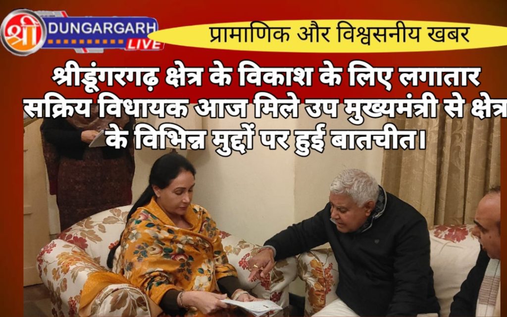 श्रीडूंगरगढ़ विधायक श्री ताराचंद सारस्वत ने जयपुर में उप मुख्यमंत्री श्रीमती दिया कुमारी से मुलाकात की। विधायक ने श्रीडूंगरगढ़ क्षेत्र की सड़कों की स्थिति से अवगत करवाया। श्री डूंगरगढ़ बाईपास व विभिन्न सड़कों के निर्माण एवं रखरखाव से जुड़े प्रस्ताव दिए। उन्होंने बजट घोषणा से जुड़े कार्यों के संबंध में भी चर्चा की। विधायक ने कहा कि राज्य सरकार के मौजूदा कार्यकाल के पहले वर्ष में क्षेत्र को अनेक सौगातें मिली। आगे भी जनहित से जुड़े कार्यों को प्राथमिकता से स्वीकृत करने की बात कही। विधायक ने श्रीडूंगरगढ़ क्षेत्र में धार्मिक पर्यटन की संभावनाओं पर भी चर्चा की। उन्होंने कहा कि विधानसभा क्षेत्र के अनेक गांवों में धार्मिक स्थल है जिनमें से पूनरासर, लखासर, तोलियासर, बिग्गा, आड़सर,रीड़ी,मसूरी, गुसाईसर बड़ा (थेह) और लिखमादेसर आदि क्षेत्रों में बड़ी संख्या में श्रद्धालु आते हैं। इन्हें धार्मिक पर्यटन क्षेत्र की दृष्टि से विकसित किया जा सकता है।
