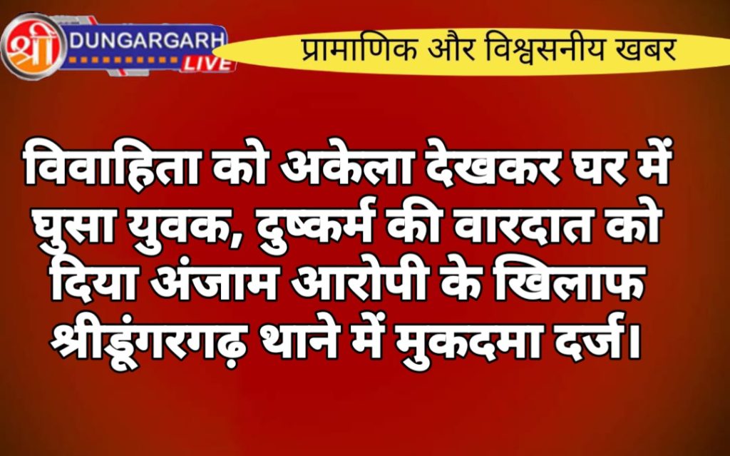 थाना क्षेत्र के एक गांव से बड़ी खबर निकलकर सामने आ रही है जहां एक युवक द्वारा विवाहिता के साथ दुष्कर्म की वारदात को अंजाम दिया गया। 33 वर्षीय पीड़ित विवाहिता द्वारा श्रीडूंगरगढ़ पुलिस को दी शिकायत के अनुसार उसका पति तेलंगाना में रहता है और वह घर पर अपने बच्चों के साथ अकेली थी। पुलिस को दी शिकायत में बताया कि वो घर में पूजा पाठ कर रही थी इस दौरान गांव का युवक भींयाराम मेघवाल घर में घुस गया और डरा धमकाकर लज्जाभंग करते हुए उसके साथ दुष्कर्म किया , वापस आकर विवाहिता को डराकर चुप रहने की भी धमकी दी गई ।पुलिस ने पीड़िता की शिकायत पर आरोपी के खिलाफ मुकदमा दर्ज कर लिया है और सब इंस्पेक्टर मलकीयत सिंह को मामले की जांच सौंपी गई हैं ।