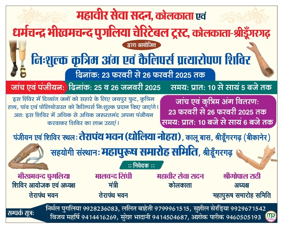महावीर सेवा सदन कोलकाता एवं धर्मचन्द्र भीखमचन्द पुगलिया चैरिटेबल ट्रस्ट श्रीडूंगरगढ़ कोलकाता द्वारा दिनांक 23 फरवरी से 26 फरवरी 2025 को निःशुल्क कृत्रिम अंग एवं कैलीपर्स प्रत्यारोपण शिविर लगाया जाएगा । इस शिविर में दिव्यांगजनो को सहारे के लिए जयपुर फुट, कृत्रिम हाथ, पांव व कैलिपर्स निःशुल्क प्रदान किए जाएंगे । शिविर के सहयोगी संस्थान महापुरुष समारोह समिति श्रीडूंगरगढ़ के अध्यक्ष श्रीगोपाल राठी ने बताया कि शिविर में पूर्व जांच एवं पंजीयन दिनांक 25 व 26 जनवरी 2025 को तेरापंथ भवन (धोलिया नोहरा) कालुबास श्रीडूंगरगढ़ में प्रातः 10 से सांय 6 बजे तक किया जाएगा । शिविर आयोजक भीखमचन्द पुगलिया ने इस निःशुल्क शिविर का जरूरतमन्द व्यक्ति अधिक से अधिक लाभ उठाएं ये निवेदन किया है । कृपया दिव्यांगजन इस शिविर में आकर अवश्य लाभ उठाएं ।