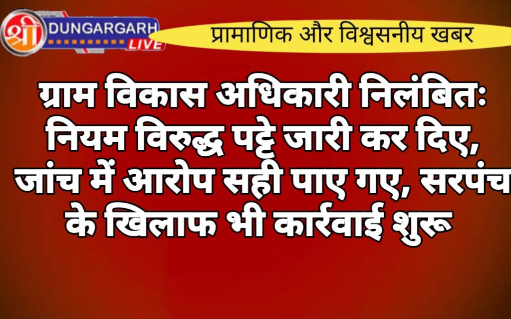 नियम विरुद्ध पट्टे जारी करने की जांच सही पाए जाने पर एक ग्राम विकास अधिकारी को निलंबित किया गया है। जिला परिषद के मुख्य कार्यकारी अधिकारी सोहन लाल ने बताया कि पूगल के कृष्णनगर के ग्राम विकास अधिकारी देवराज सिंह के विरूद्ध बीकानेर पंचायत समिति के मूंडसर पदस्थापन अवधि में पंचायती राज अधिनियम 1996 के नियम 157(1) के अन्तर्गत नियम विरूद्ध पट्टे जारी करने की शिकायत प्राप्त हुई।
