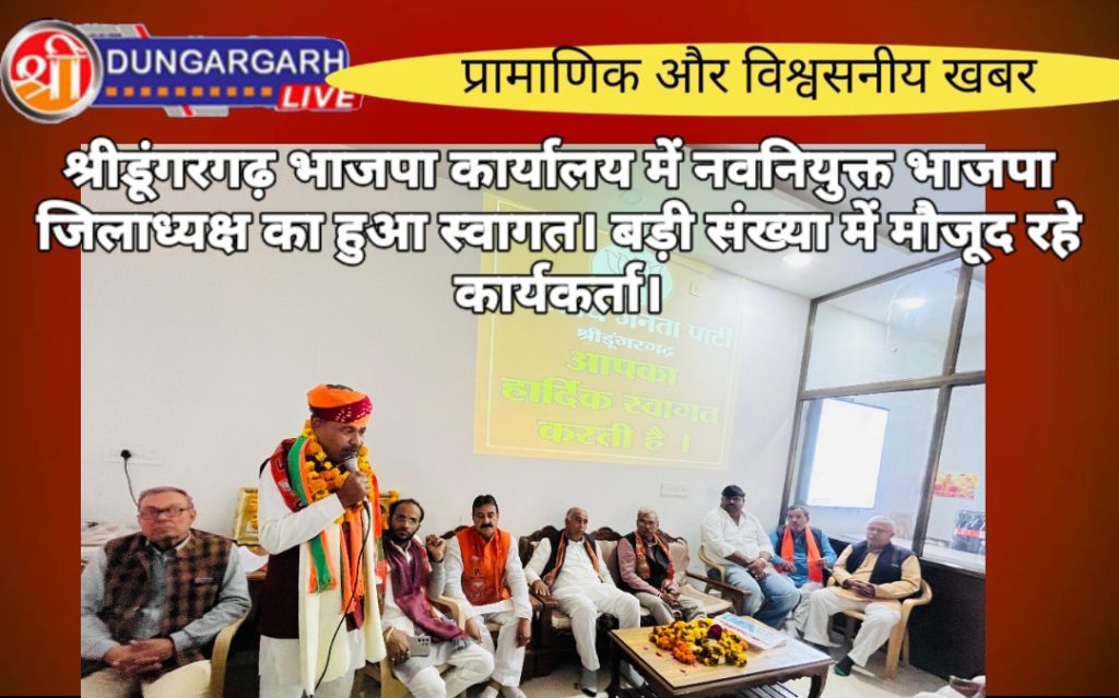 विधायक जन सेवा केंद्र भाजपा कार्यालय श्री डूंगरगढ़ में नवनिर्वाचित बीकानेर देहात के जिलाध्यक्ष श्रीमान श्याम जी पंचारिया का प्रथम बार श्रीडूंगरगढ़ पधारने पर सभी मंडल अध्यक्षों एवं सभी भाजपा कार्यकर्ताओं द्वारा भव्य स्वागत किया गया जिसमें जिलाध्यक्ष के साथ में पधारे विश्वकर्मा कौशल विकास बोर्ड के अध्यक्ष रामगोपाल सुथार, युवा गुजरगोड़ ब्राह्मण महासभा के राष्ट्रीय अध्यक्ष अनिल जोशी,इन सब का भव्य स्वागत किया विधायक प्रतिनिधि सत्यनारायण सारस्वत गुंसाईसर बड़ा सरपंच,नगरपालिका अध्यक्ष मानमल शर्मा, ओबीसी मोर्चा के जिलाध्यक्ष विनोद गिरी गुसाई,अल्प संख्यक मोर्चा के जिलाध्यक्ष इमरान राइन,पूर्व शहर मंडल अध्यक्ष महावीर प्रजापत,पूर्व बापेऊ मंडल अध्यक्ष गिरधारी गोदारा,देहांत मंडल अध्यक्ष महेंद्र सिंह तंवर,मोमासर मंडल अध्यक्ष नरेश मोट,बापेऊ मंडल अध्यक्ष राजू गोदारा,पूर्व नगरपालिका अध्यक्ष रामेश्वर जी पारीक,शिव स्वामी,पंचायती राज के जिलासंयोजक हेमनाथ जाखड़,महेश राजोतिया,मोहननाथ सिद्ध,युवा मोर्चा जिला उपाअध्यक्ष भवानीप्रकाश तावनिया, उतमनाथ सिद्ध,मूलचंद इंदौरिया,मांगीलाल राठी,पार्षद जगदीश गुर्जर,रजत आसोपा, भरत सुथार,विक्रम सिंह शेखावत,अरुण पारीक,लोकेश गौड़,रमेश मुंधडा,ओमप्रकाश नाई,नंदू नाई महेंद्र सिंह,श्याम पुरोहित,गोपाल शास्त्री,हेमराज भादानी,राकेश बिहानी,राम सोनी,शंकर सोनी, नंदू सोनी,नंदू गोदारा,हरिशंकर पुरोहित बिग्गा,पूर्व डूंगर कॉलेज अध्यक्ष मांगीलाल गोदारा,आईदान शर्मा,संदीप कायल,भगवत ओझा,सुखवीर भार्गव,पवन स्वामी,रेवंत सैन,पूर्व सरपंच ओमप्रकाश नाई,सरपंच पवन शर्मा,रतन सिंह,ओमप्रकाश शर्मा, श्रवण मेघवाल, ऊकाराराम,श्रवण सरपंच,मेघराज शर्मा, धुंडाराम डेलू,मनीष गिरी,पृथ्वीराज व्यास, भीयानाथ सिद्ध,जगदीश पारीक,शुभकरण बिश्नोई,रामनिवास बिश्नोई,बजरंग प्रजापत,धनराज सोनी,मेघराज सोनी,गजानंद पलोड,मूलचंद मेघवाल,गंगाधर शर्मा,अगरसिंह पडिहार,दलीप पंचारिया, भागूनाथ,देवीलाल शर्मा,महेंद्र स्वामी, नंदू सिंह राजपुरोहित,गोपालसिंह राजपुरोहित,गोविंद पारीक,विजयशंकर व्यास,बीजू भोजक,ओंकारनाथ, ओमनाथ पूनरासर एवं समस्त भाजपा कार्यकर्ता स्वागत कार्यक्रम में सम्मिलित हुए।