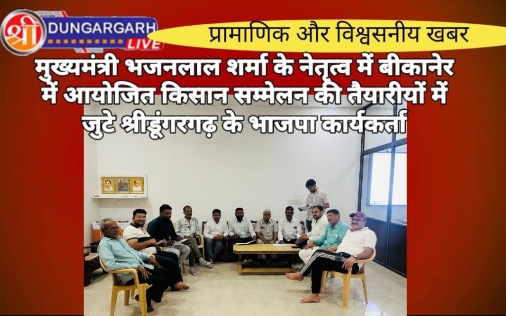 कल बुधवार को स्वामी केशवानंद कृषि विश्वविद्यालय परिसर बीछवाल बीकानेर में आयोजित किसान सम्मेलन में राजस्थान के मुख्यमंत्री भजनलाल शर्मा शिरकत करेंगे। मुख्यमंत्री के स्वागत और किसान सम्मेलन में ज्यादा से ज्यादा संख्या में शामिल होने के लिए श्रीडूंगरगढ़ विधायक ताराचंद सारस्वत के निर्देशन में श्री डूंगरगढ़ भाजपा कार्यालय में तैयारी करते हुए कार्यकर्ताओं को ज्यादा से ज्यादा संख्या में कार्यकर्ताओं को ले जाने की तैयारी की । तैयारी बैठक में भाजपा के वरिष्ठ कार्यकर्ता महावीर प्रजापत, देहात मंडल अध्यक्ष महेंद्र सिंह तंवर,शहर मंडल अध्यक्ष राधेश्याम दर्जी,मोमासर मंडल अध्यक्ष नरेश मोट,पार्षद जगदीश गुर्जर,शहर महामंत्री महेश राजोतिया,युवा मोर्चा के जिलाउपाध्यक्ष भवानी प्रकाश तावनिया,युवा मोर्चा के उत्तम नाथ सिद्ध,मूलचंद इंदौरिया,के के जांगिड़,संदीप कायल,हरिशंकर पुरोहित बिग्गा,अर्जुनलाल शर्मा जैतासर एवं समस्त भाजपा कार्यकर्तागण मौजूद रहे।