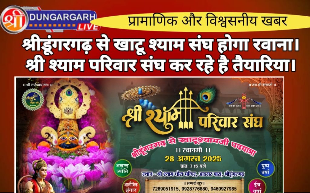 श्रीडूंगरगढ़ श्याम परिवार संघ खाटू श्याम जी पैदल यात्रा हर साल की भांति इस साल भी बड़ी धूमधाम से जाएंगे। संघ का पोस्टर विमोचन होने के साथ ही संघ के अध्यक्ष प्रहलाद तोलंबिया ने जानकारी देते हुए बताया कि दिनांक 28 अगस्त 2025 को सुबह 7:00 बजे श्याम धोरा मंदिर से रवाना होकर मुख्य मार्गो से होते हुए बड़े धूमधाम से खाटू धाम के लिए रवाना होगा साथ में यह जानकारी देते हुए बताया कि संघ में कोई पैदल यात्री अगर जाना चाहता है तो वह 9799 30 8088 पर संपर्क करें।