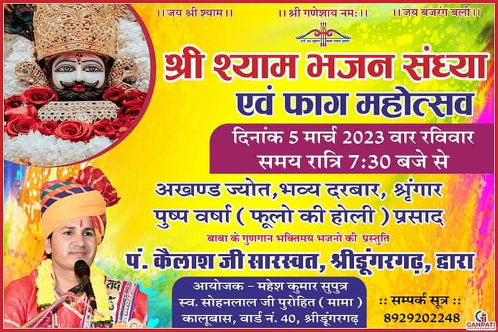 श्रीडूंगरगढ़ लाइव…5 मार्च 2023।आज रात्रि 7:30 बजे से श्रीडूंगरगढ़ के वार्ड 40 में महेश पुत्र स्व सोहनलाल पुरोहित (मामा) के घर के सामने श्रीश्याम भजन संध्या एवं फाग महोत्सव का आयोजन होगा।