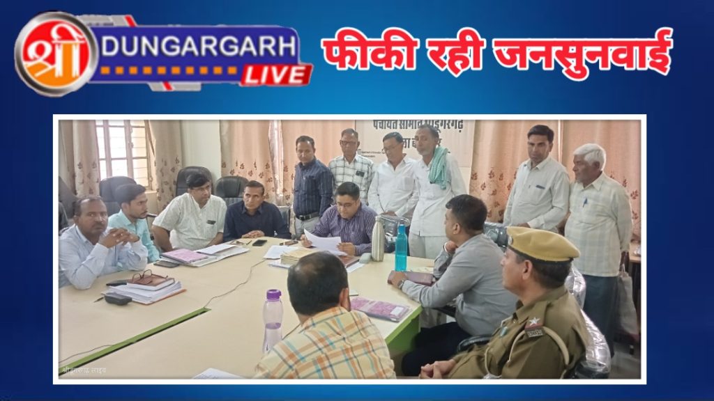 श्रीडूंगरगढ़ लाइव…9 मार्च 2023।श्रीडूंगरगढ़ के नवपदस्थ उपखण्ड अधिकारी मुकेश चौधरी ने आज अपनी पहली जनसुनवाई की। श्रीडूंगरगढ़ पंचायत समिति सभागार में इस जनसुनवाई से आमजन लगभग नदारद रहा। श्रीडूंगरगढ़ क्षेत्र की जनता इससे अनभिज्ञ ही रही।कुछेक जनप्रतिनिधि ही जनसुनवाई में पहुंचे।