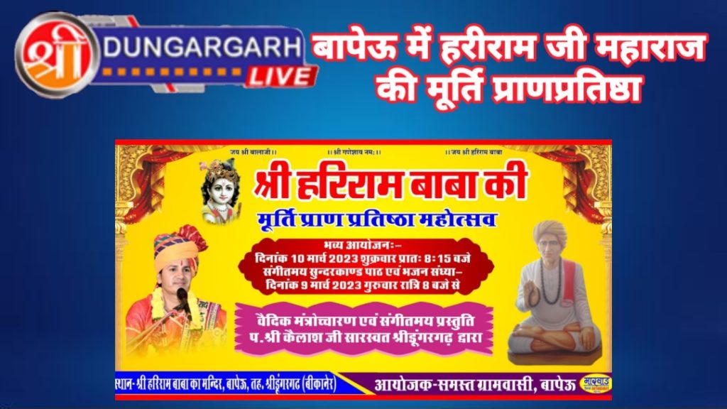 श्रीडूंगरगढ़ लाइव…9 मार्च 2023। धर्मनगरी श्रीडूंगरगढ़ के बापेऊ में ग्रामवासियों द्वारा गांव हरीराम बाबा मंदिर में कल 10 मार्च को श्री हरीराम बाबा की मूर्ति की प्राणप्रतिष्ठा होगी।आज शाम को मूर्ति को वैदिक मंत्रोच्चार के साथ महास्नान करवाया जाएगा तत्पश्चात सुन्दरकाण्ड एवं हरीराम बाबा का संगीतमय जागरण होगा।कल सुबह झोरड़ा से हरीराम बाबा की ज्योत आयेगी और मूर्ति की प्राणप्रतिष्ठा की जायेगी।सभी वैदिक कार्य श्रीडूंगरगढ़ के प्रख्यात कथावाचक और सुन्दरकाण्ड गायक पं. कैलाश सारस्वत द्वारा करवाये जायेंगे।