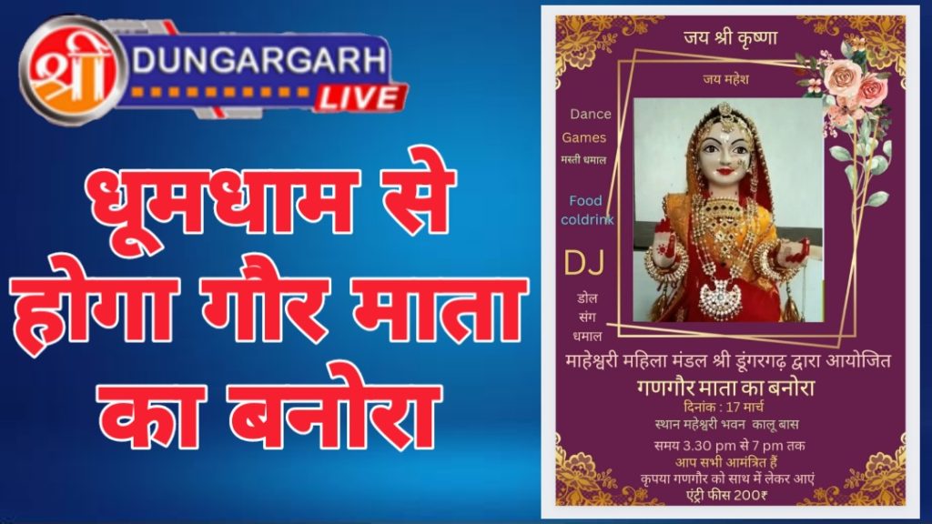 श्रीडूंगरगढ़ लाइव…15 मार्च 2023।श्रीडूंगरगढ़ क्षेत्र में सेवा का पर्याय बन चुकी है माहेश्वरी महिला मंडल की मातृशक्ति। चाहे कोरोना काल मे असहाय लोगो की मदद करना हो,चाहे गौसेवार्थ दान पुण्य करना हो या फिर किसी सामाजिक सौहार्द का कार्य हो,माहेश्वरी महिला मंडल ने आगे बढ़कर सेवा के कार्य किये है। मंडल सांस्कृतिक कार्यक्रमों में हिस्सा लेता भी है और वृहत स्तर पर ऐसे कार्यक्रम करवाता भी है।माहेश्वरी महिला मंडल की सुधा डागा ने बताया कि मंडल इस गणगौर को यादगार बनाने के लिये कस्बे की महिलाओं के लिए गणगौर उत्सव कर रही है। 17 मार्च को महिला मंडल द्वारा गणगौर माता का बनोरा निकाला जायेगा जिसमे कस्बे की कोई भी मातृशक्ति हिस्सा ले सकती है।यह आयोजन माहेश्वरी भवन कालुबास में होगा।धूमधड़ाके से ओतप्रोत इस कार्यक्रम में डांस,म्यूज़िक, गेम्स के साथ खाना भी होगा।कार्यक्रम का प्रवेश शुल्क 200/-रुपये प्रति महिला रखा गया है।आयोजन से संबंधित किसी भी प्रकार की जानकारी के लिए आप 93511 45334 तथा 70149 06780 पर सम्पर्क कर सकते है।