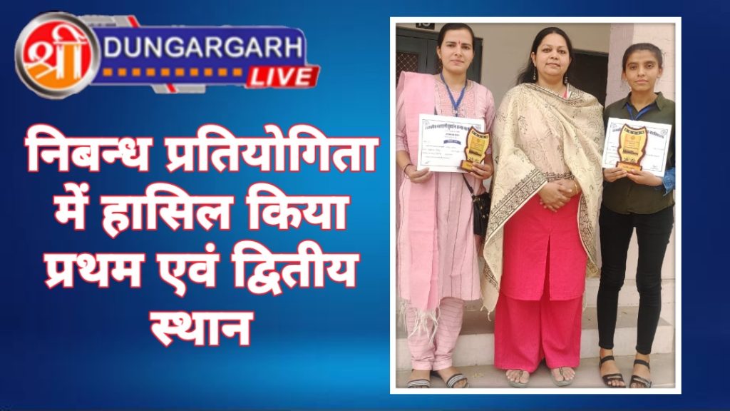 श्रीडूंगरगढ़ लाइव…15 मार्च 2023।बीकानेर की महारानी सुदर्शन महाविद्यालय में उपभोक्ता क्लब के संयुक्त तत्वाधान में आयोजित जिला स्तरीय निबन्ध प्रतियोगिता में श्रीडूंगरगढ़ की राजकीय कन्या महाविद्यालय की कांता लाम्बा पुत्री ओमप्रकाश लाम्बा ने प्रथम और राजकीय महाविद्यालय की सोनू कंवर पुत्री प्रहलादसिंह ने द्वितीय स्थान प्राप्त किया। महाविद्यालय परिवार द्वारा दोनों को शुभकामनाएं दी गयी।