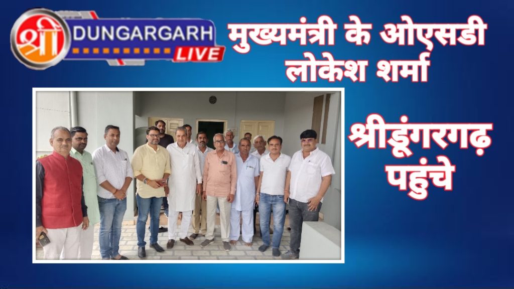 श्रीडूंगरगढ़ लाइव…16 मार्च 2023।बीकानेर से जयपुर जाते वक़्त श्रीडूंगरगढ़ राजस्थान के मुख्यमंत्री अशोक गहलोत के ओएसडी लोकेश शर्मा पूर्व विधायक मंगलाराम गोदारा ने अपने निज निवास पर रुके।पूर्व विधायक ने शॉल और साफा पहनाकर शर्मा का स्वागत किया।