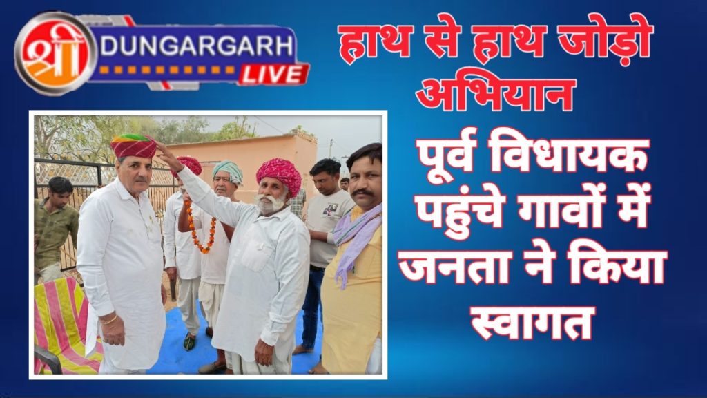 श्रीडूंगरगढ़ लाइव…16 मार्च 2023।कांग्रेस सरकार की जनकल्याणकारी योजनाओं को लेकर आज पूर्व विधायक मंगलाराम गोदारा धर्मास और हत्थाना जोहड़ पहुंचे।आमजन को राज्य सरकार की जनहितकारी योजनाओ के बारे में बताया।गोदारा ने कहा कि जनताबने कांग्रेस सरकार पर विश्वास जताया है और 2023 में भी कांग्रेस की दोबारा सरकार बनेगी।