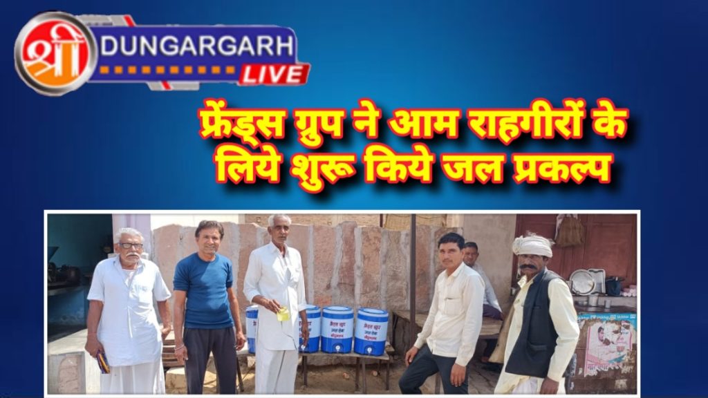 श्रीडूंगरगढ़ लाइव…20 मार्च 2023।गर्मी का मौसम आते ही सामाजिक संस्थाएं अबोल जीवो और मानवमात्र की सेवा में लग जाते है।कहीं प्याऊ,कहीं पाळसिये तो कहीं पशुओं की खेळी में पानी की व्यवस्था करना ही इन संस्थाओं के सेवादारों का मुख्य कार्य हो जाता है।कस्बे की सामाजिक संस्था फ्रेंड्स ग्रुप अपने सेवाकार्यो के लिये कटिबद्ध है।गर्मी के मौसम की शुरुआत से ही इस ग्रुप ने आम राहगीरों की प्यास मिटाने का संकल्प लेकर अपने “जलसेवा” प्रकल्प का शुभारंभ कर दिया है।जल सेवा के व्यस्थापक हीरालाल पुगलिया ने बताया कि फ्रेंड्स ग्रुप कस्बे के प्रमुख स्थानों हाई स्कूल रोड, मातुश्री भवन के पास,सरकारी अस्पताल के पास,माताजी मंदिर के पास, कालू रोड,घास मंडी के पास,भादानी मार्ग एवं तुलसी सेवा संस्थान के पास राहगीरों के लिए शीतल जल की व्यवस्था की गई हैं। पवन उपाध्याय, गोरू माली, प्रवीण पुगलिया, पवन व्यास,मोहन नाई,राजू माली आदि कार्यकर्ता इस सेवाकार्य मे सहयोगी है।
