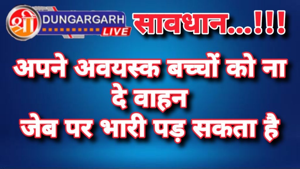 श्रीडूंगरगढ़ लाइव…1 अप्रेल 2023।अगर आप भी अपने नाबालिग बच्चे को वाहन चलाने के लिए देते है तो सावधान हो जाये।सम्पूर्ण बीकानेर जिले में पुलिस द्वारा अभियान चलाया जा रहा है।श्रीडूंगरगढ़ पुलिस थानाधिकारी अशोक विश्नोई ने बताया कि क्षेत्र में दोपहिया वाहनों की होने वाली दुर्घटनाओं में ज्यादातर बिना हेलमेट के होते है या फिर नाबालिग होते है जो रोड सेफ्टी का ध्यान नही रखते है। बीकानेर जिले में शनिवार से नो डीएल नो ड्राइव अभियान शुरू होगा। इसके तहत नाबालिग के गाड़ी चलाते पकड़े जाने पर उसके अभिभावक से ट्रैफिक पुलिस दस हज़ार रुपए का जुर्माना वसूल करेगा। इतना ही नहीं बिना लाइसेंस के पकड़े गए वाहन चालक से पांच हजार रुपए और गाड़ी मालिक से पांच हजार रुपए का जुर्माना वसूले जाने का प्रावधान भी रखा गया है।श्रीडूंगरगढ़ में भी इस अभियान की शुरुआत आज से ही होगी।