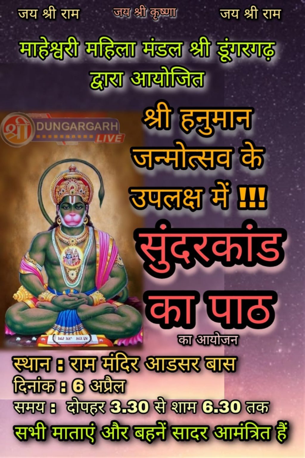 श्रीडूंगरगढ़ लाइव…5 अप्रेल 2023। कल 6 अप्रेल को श्री हनुमान जन्मोत्सव के उपलक्ष्य में कस्बे के देवालयो में विशेष पूजा अर्चना और कार्यक्रम रखे गए है।पं विष्णु शास्त्री ने बताया कि कालुबास के बोथरा कुआँ पूनरासर हनुमान मंदिर में गौसेवार्थ सुंदरकांड मंडली द्वारा सुन्दरकाण्ड किया जायेगा।कस्बे की माहेश्वरी महिला मंडल की मातृशक्ति द्वारा कस्बे के आडसरबास श्रीराम मंदिर में दोपहर 3:30 बजे सामूहिक सुंदरकांड के पाठ किये जायेंगे।