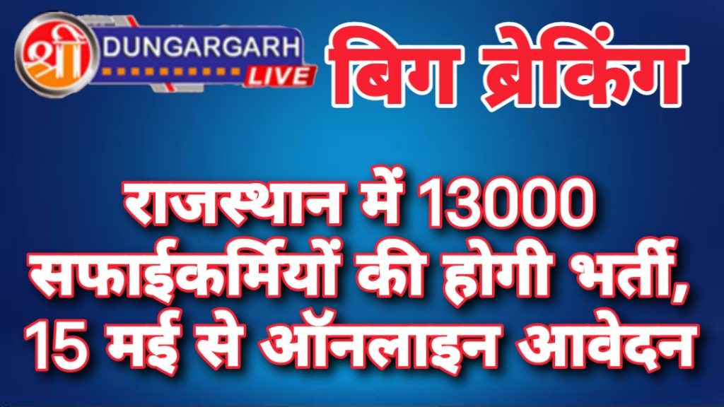 श्रीडूंगरगढ़ लाइव…22 अप्रेल 2023।राजस्थान की 176 नगरीय निकायों (नगर निगम, नगर पालिका और नगर परिषद) में 13 हजार 184 पदों पर सफाई कर्मचारियों की भर्ती की जाएगी। इसके लिए ऑनलाइन आवेदन 15 मई से शुरू होंगे। साल 2018 के बाद राज्य में अब सफाई कर्मचारियों की भर्ती की जा रही है।