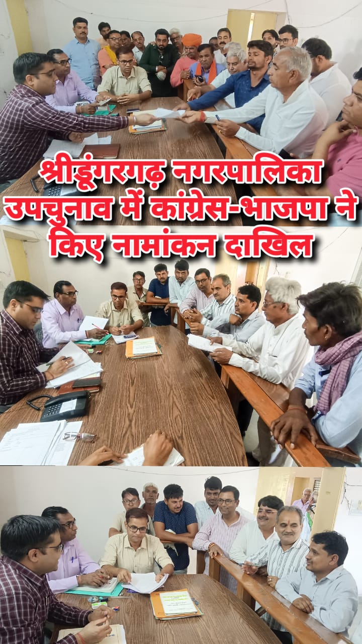 श्रीडूंगरगढ़ लाइव…24 अप्रेल 2023।श्रीडूंगरगढ़ नगरपालिका के वार्ड 2 के उम्मीदवार के देहांत के बाद रिक्त हुई सीट पर उपचुनाव के लिए आज नामांकन दाखिल हुए।कांग्रेस और भाजपा ने अपने कार्यकर्ताओं के साथ अपने अपने उम्मीदवारों का नामांकन दाखिल किये।आज श्रीडूंगरगढ़ उपखण्ड कार्यालय में उपखण्ड अधिकारी मुकेश चौधरी के समक्ष भाजपा और कांग्रेस ने नामांकन भरे।भाजपा से बृजलाल पुत्र जगदीश मेघवाल को प्रत्याशी बनाया गया।नामांकन दाखिल करते समय पूर्व भाजपा देहात जिलाध्यक्ष ताराचंद सारस्वत, रामगोपाल सुथार, नगरपालिका अध्यक्ष मानमल शर्मा, भाजपा नेता शिवप्रसाद तावणियाँ, पूर्व जिला परिषद सदस्य हेमनाथ जाखड़,शहर अध्यक्ष महावीर प्रसाद अड़ावलिया, पार्षद विनोदगिरी गुसाईं,सत्यनारायण नाई,जगदीश गुर्जर, पवन उपाध्याय, लोकेश गोड,विक्रमसिंह शेखावत,भरत सुथार, गोपाल छापोला, भवानीसिंह बीका,ओम सातलेरा सहित भाजपा के अनेक कार्यकर्ता उपस्थित रहे।