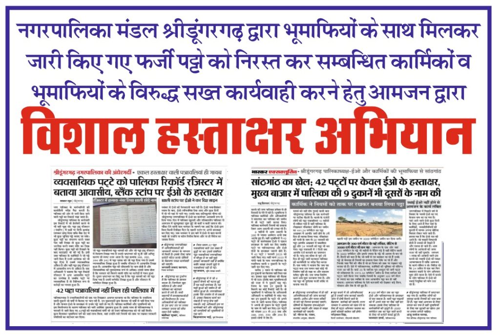 श्रीडूंगरगढ़ लाइव…27 अप्रेल 2023। श्री डूंगरगढ़ नगरपालिका के भ्रष्टाचार और भ्रष्ट तंत्र के खिलाफ आमजन अब लामबंद हो रहा है।श्री डूंगरगढ़ की संस्था मानवाधिकार एवं आरटीआई जागरूकता समिति के बैनर तले श्री डूंगरगढ़ के युवा एवं आमजन इस भ्रष्ट तंत्र के खिलाफ हस्ताक्षर अभियान शुरू कर रहे हैं।समिति कल सुबह कस्बे के पुराने बस स्टैंड पर हस्ताक्षर अभियान शुरू करेगी।समिति समस्त शहरवासियों से इस हस्ताक्षर महाभियान से जुड़ने का आह्वान कर रही है।
