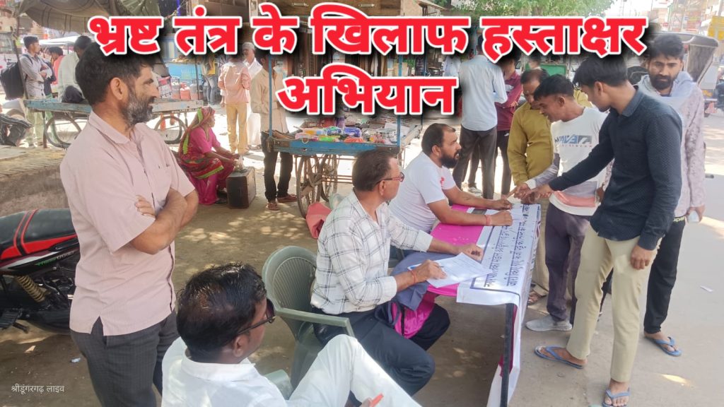 श्रीडूंगरगढ़ लाइव…28 अप्रेल 2023। श्री डूंगरगढ़ नगर पालिका के भ्रष्ट तंत्र के खिलाफ आज श्री डूंगरगढ़ के युवा तथा मानवाधिकार एवं आरटीआई जागरूकता समिति ने हस्ताक्षर अभियान छेड़ दिया है।श्री डूंगरगढ़ के आमजन का मिल रहा है भरपूर सहयोग।