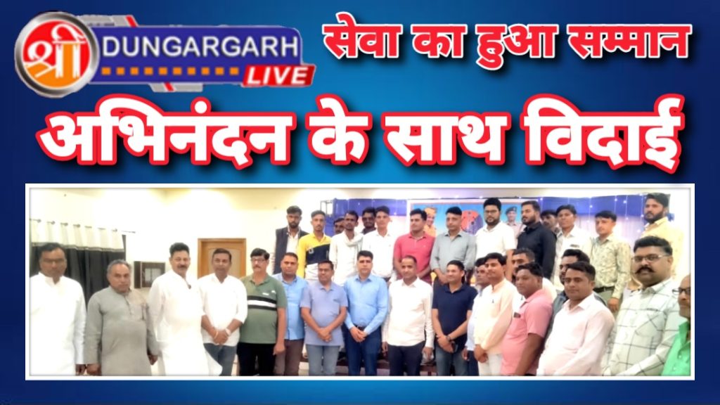 श्रीडूंगरगढ़ लाइव…28 अप्रेल 2023।क्षेत्र के दलित नेता राजेन्द्र मेघवाल बापेऊ के नेतृत्व में सुनील कुमार मेहरड़ा अतिरिक्त पुलिस अधीक्षक बीकानेर ग्रामीण,वृताधिकारी दिनेश कुमार परिहार का पदोन्नति होकर स्थानांतरण होने पर विदाई समारोह होटल करणी रिसोर्ट में आयोजित किया गया।